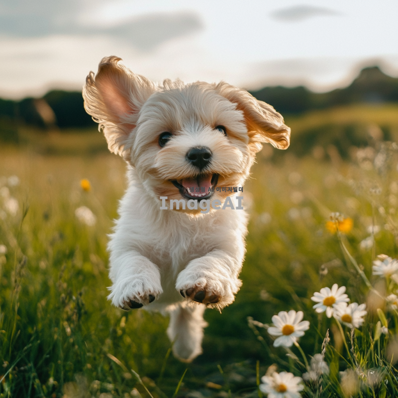 푸른 들판을 배경으로 기쁨에 가득 차 뛰어다니는 작은 강아지, 햇빛을 받아 반짝이는 털, 생기 넘치는 표정, 주변에는 야생화가 흩어져 있는 모습, 맑은 하늘과 부드러운 구름이 어우러진 풍경, 강아지의 귀가 바람에 살짝 날리는 장면.