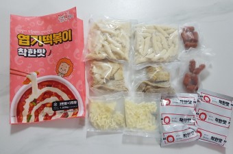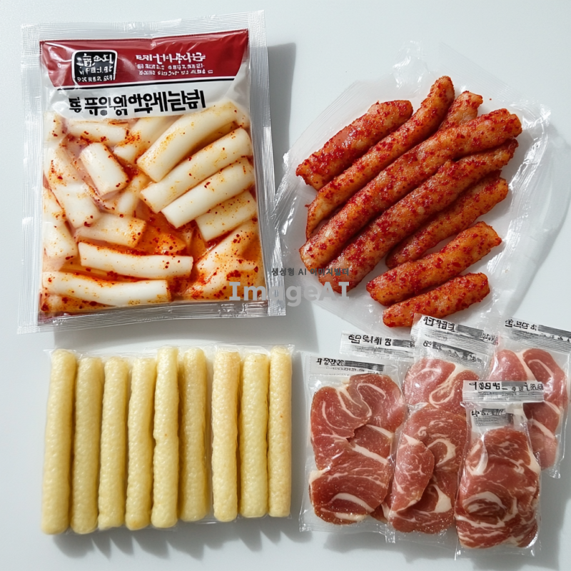 흰색 배경에 떡볶이 밀키트 포장지가 있다. 옆에 포장된 떡볶이 떡, 포장된 치즈, 포장된 빨간 가루, 포장된 베이컨, 포장된 어묵이 나열되어 있다.