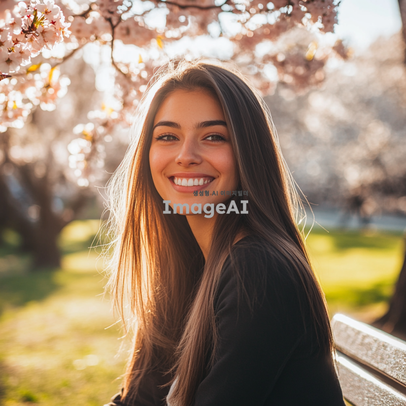 20대 한국인 여성, 긴 생머리, 밝은 미소, 화사한 봄날의 공원에서 벤치에 앉아 있는 모습, 주변에는 벚꽃이 만개해 있으며, 따뜻한 햇살이 그녀의 얼굴을 부드럽게 비추고 있는 장면, 캐주얼한 옷차림, 자연스러운 포즈, 생동감 있는 색감.