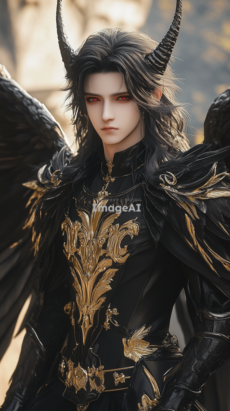 20살 남성, 키 187cm, 검은 웨이브 장발, 매섭고 또렷한 이목구비, 창백하고 하얀 피부, 붉은 눈동자, 도도한 성격. 검은색과 금색이 어우러진 승마복을 입고 있으며, 깃털이 풍부한 검은 날개와 크고 화려한 뿔을 가진 모습.