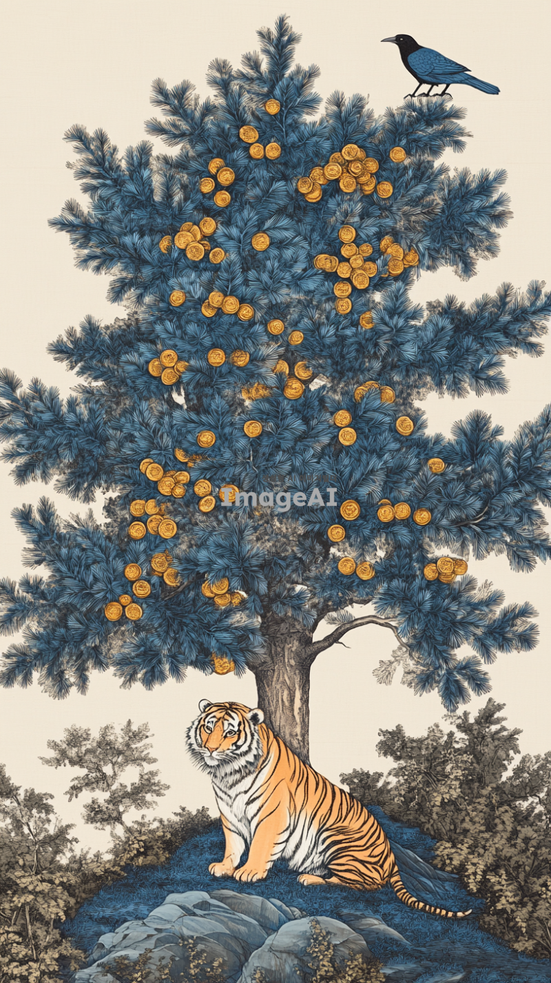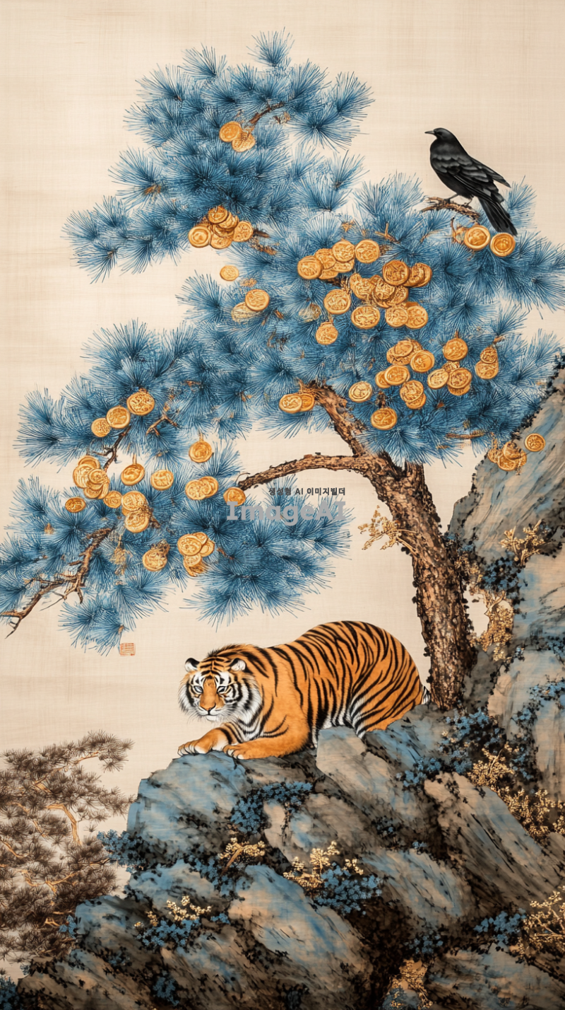 푸른 소나무 전체가 보이는 풍경, 소나무 밑에는 큰 호랑이가 그림 밖을 응시하고 있음. 소나무 가지에는 금화가 주렁주렁 열려있고, 소나무 위에는 까치가 앉아있는 장면.