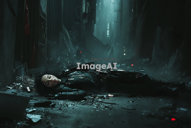 도시의 어두운 골목길에 쓰러져 있는 여자 히어로, 온몸에 부상을 입고 있으며, 그녀의 슈트는 찢어져 있고 여기저기 긁힌 자국이 있다. 주변에는 파편과 부서진 건물의 잔해가 흩어져 있고, 희미한 가로등 불빛이 그녀의 모습을 비추고 있다. 히어로의 얼굴에는 결의와 피로가 함께 묻어 있으며, 그녀의 손에는 아직도 강한 의지가 느껴진다. 배경은 도시의 밤, 긴장감이 감도는 분위기.