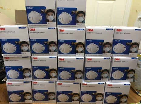 3M 마스크가 여러 상자에 깔끔하게 쌓여 있는 모습, 조명이 부드럽게 비추는 실내 공간, 마스크 상자에 3M 로고가 선명하게 보이는 장면,
