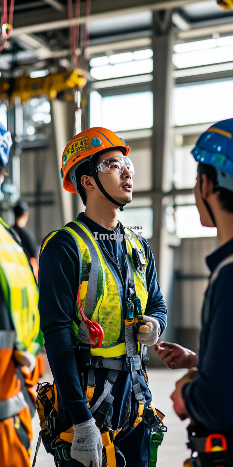산업 현장에서 다양한 작업을 수행하는 한국인 근로자들이 안전 장비를 착용하고 협력하는 모습. 근로자들은 헬멧, 안전 고글, 반사 조끼 등을 착용하고 있으며, 서로의 안전을 확인하며 대화를 나누고 있다. 배경에는 안전 표지판과 안전 지침이 잘 보이는 작업장이 있으며, 작업장 내부는 깔끔하고 정돈된 모습이다. 햇빛이 밝게 비추는 날씨 속에서 근로자들의 얼굴에는 안전한 작업 환경에서 일하는 것에 대한 만족감과 자신감이 드러나 있다.