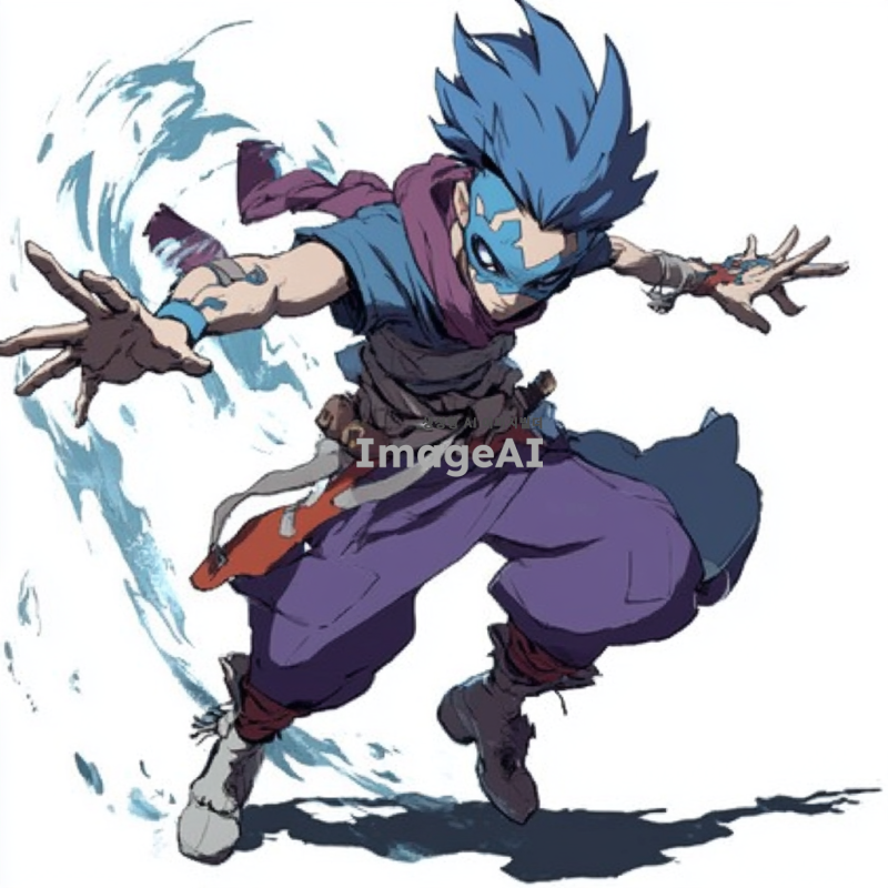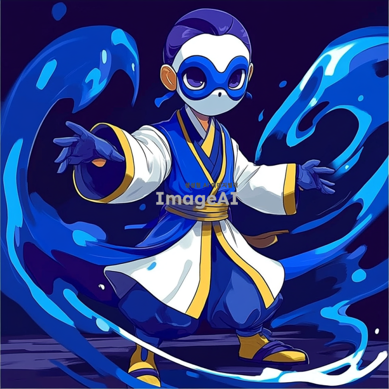 애니메이션 스타일의 한국인 남성 캐릭터, 보라색과 파란색이 섞인 머리카락, 멋진 용 모양의 가면을 착용, 하얀 피부, 역동적이고 카리스마 있는 포즈, 세련된 의상과 배경.