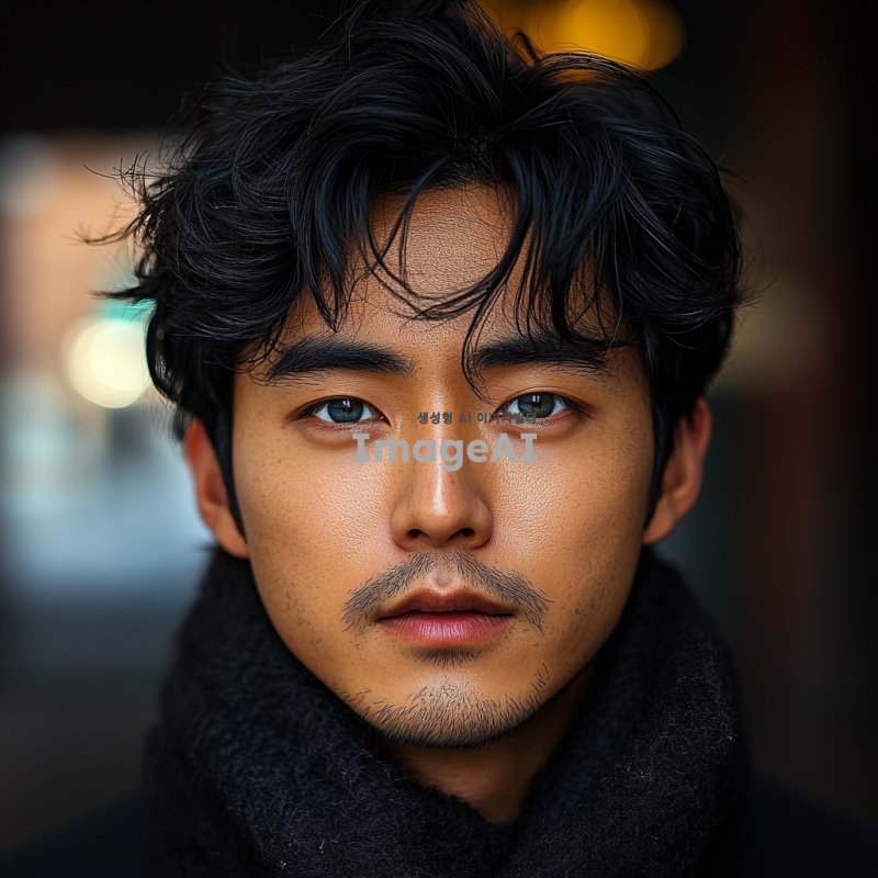 잘생긴 한국인 남성, 블랙 헤어, 푸른 눈, 살짝 째진 눈매, 약간의 양아치 느낌, 짝눈, 세련된 스타일, 도시 배경, 매력적이고 자신감 넘치는 표정.