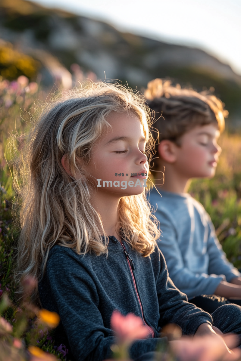 들판에 앉아 눈을 감고 명상하는 세 명의 아이들: 10살 남자아이, 8살 여자아이, 6살 남자아이. 아이들은 편안한 자세로 앉아 있으며, 주변에는 꽃과 풀이 가득한 들판이 펼쳐져 있다. 바람이 솔솔 불어와 아이들의 머리카락과 옷자락이 살짝 흔들리고, 햇살이 따뜻하게 내리쬐어 평화로운 분위기를 자아낸다. 멀리서 들리는 새소리가 배경을 채우며 자연의 아름다움을 더한다. 전체적인 색조는 따뜻하고 부드러운 느낌으로 표현되어 있다.