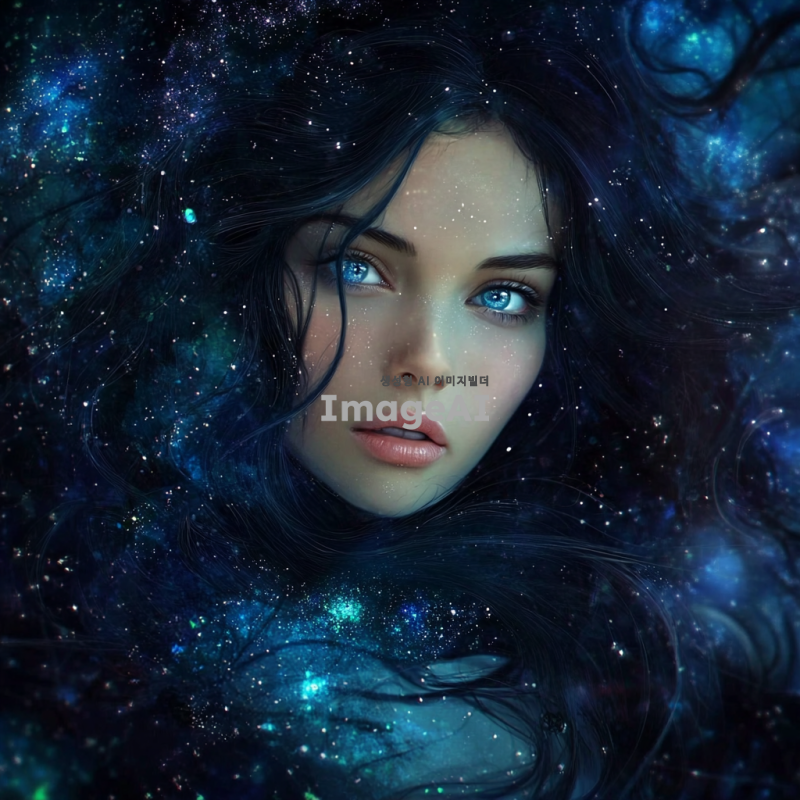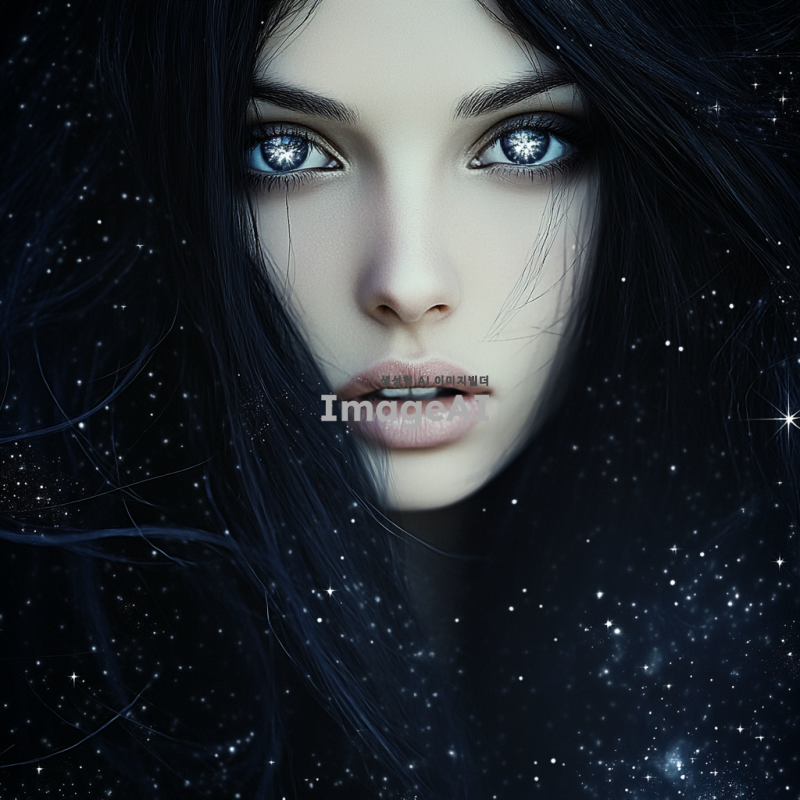 별빛이 쏟아지는 밤하늘처럼 검은 긴 생머리를 가진 아름다운 여성, 그녀의 눈동자는 프리즘을 연상시키는 빛나는 흰색이다. 그녀는 다정하고 상냥하며 어른스러운 성격을 지니고 있으며, 사연이 있지만 여전히 아이들과 인간을 믿고 사랑하는 모습을 보여준다. 그녀의 이름은 '아비'로, 무한이라는 의미를 내포하고 있다. 그녀의 모습은 평화롭고 따뜻한 분위기를 자아내며, 주변에는 별빛이 반짝이는 밤하늘의 풍경이 어우러져 있다.