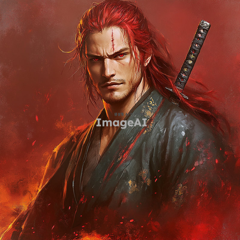 길고 묶여져 있는 붉은 머리카락에 왼쪽는에는 세로로 상처가 있으며 빨간색 눈동자이다 일본식느낌에 도사복이며 검이 등뒤에 한자루 허리에 두자루가 있다 남자이다