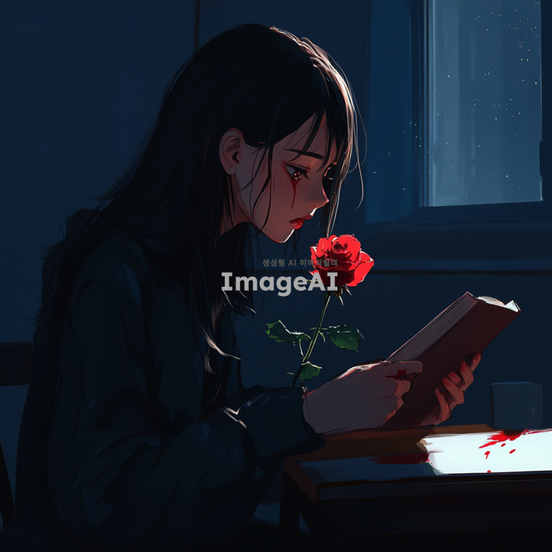 어두운 방 안에서 책상에 앉아 있는 학생이 졸린 눈으로 책을 바라보고 있다. 학생의 손은 가시가 돋아있는 붉은 장미를 잡고 있으며, 손가락 끝에서 약간의 붉은 물이 맺혀있다. 장미의 가시는 빛을 받아 반짝이고 있으며, 학생의 표정은 아픔과 함께 깨어나는 듯한 느낌을 준다. 방 안은 조용하고 집중된 분위기를 자아내며, 창문으로 들어오는 희미한 달빛이 장면을 부드럽게 비춘다.