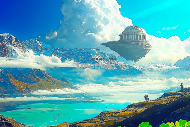 푸르고 광활한 하늘 아래, 중앙에는 뾰족하고 깍듯한 산맥이 구름을 뚫고 솟아오르는 장면. 아래에는 커다랗고 맑은 푸른 호수가 펼쳐져 있으며, 호수 위 하늘로 솟아오른 섬에는 콜로세움을 닮은 건축물이 우뚝 서 있는 모습. 자연과 건축물이 조화롭게 어우러진 풍경.