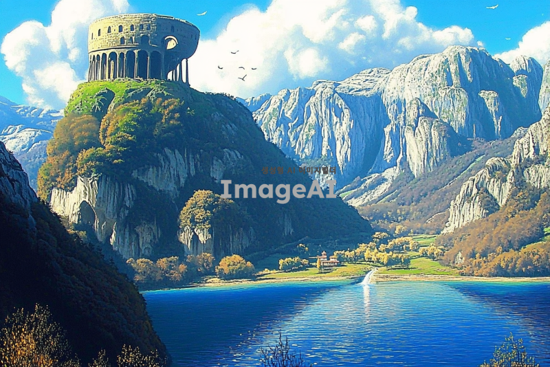 광활하고 푸르고 높은 하늘, 하늘을 찌르듯 높은 산맥. 깊이를 알 수 없을 정도로 푸르고 맑은 넓은 호수와 그 위로 솟아올라 호숫가 물이 흐르고 있는 콜로세움이 있는 하늘섬