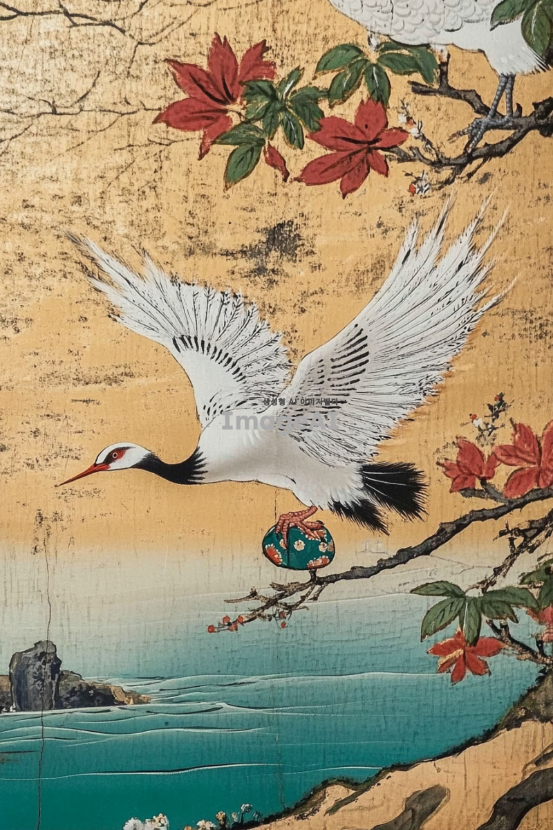 전통적인 한국 민화 스타일로 그려진 학, 학이 복주머니를 들고 하늘로 날아오르는 웅장하고 따뜻한 느낌