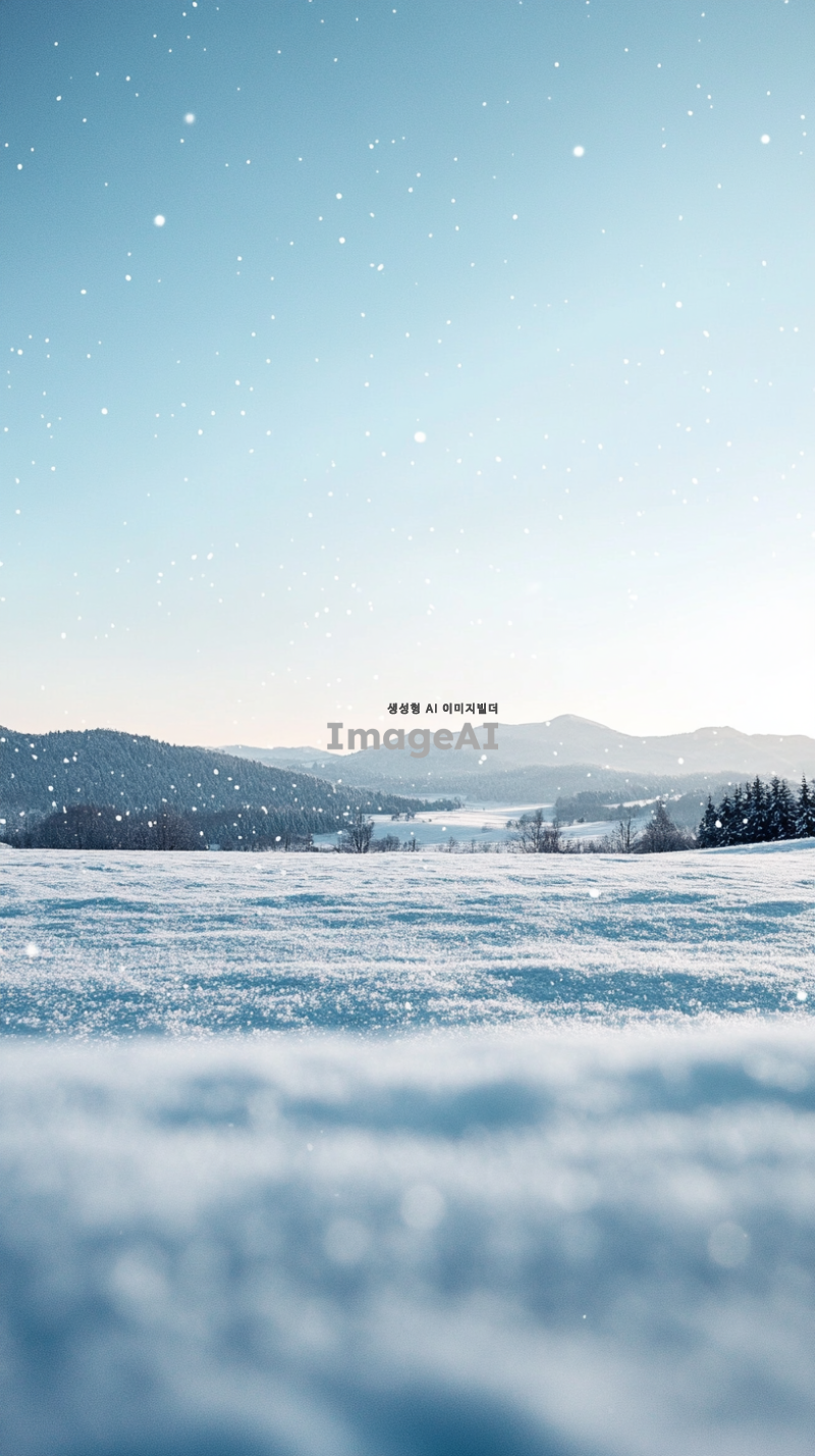 눈 덮인 광활한 겨울 들판, 멀리 보이는 산맥, 맑은 하늘과 함께 부드럽게 떨어지는 눈송이, 고요하고 평화로운 분위기, 차가운 공기가 느껴지는 장면, 자연의 아름다움과 겨울의 고요함이 조화를 이루는 풍경.