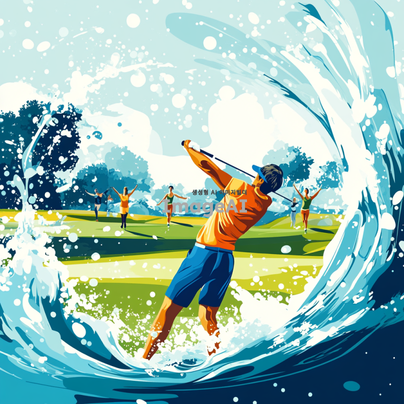 골프를 치는 사람, 푸른 잔디 위에서 진지한 표정으로 스윙을 준비하는 모습, 배경에는 맑은 하늘과 나무들이 펼쳐져 있는 골프장