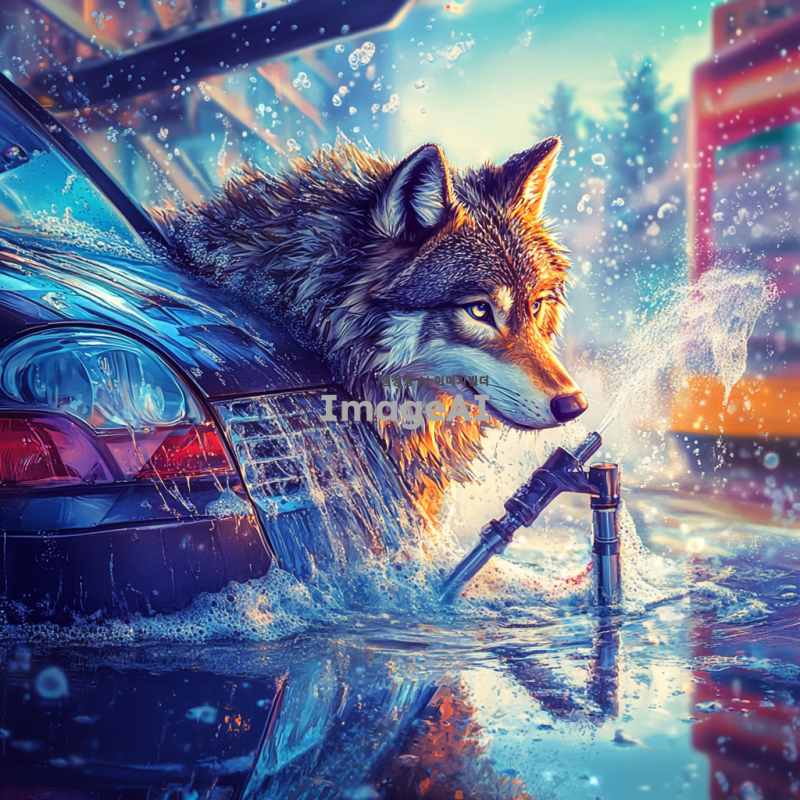 세차장에서 자동차를 청소하는 멋있는 늑대, 늑대는 세차 도구를 사용하며, 물과 비누 거품이 주변에 가득한 장면, 늑대의 털이 약간 젖어있고, 자동차는 현대적인 디자인, 배경은 세차장의 디테일이 잘 드러나도록 표현, 밝고 생동감 있는 색감.