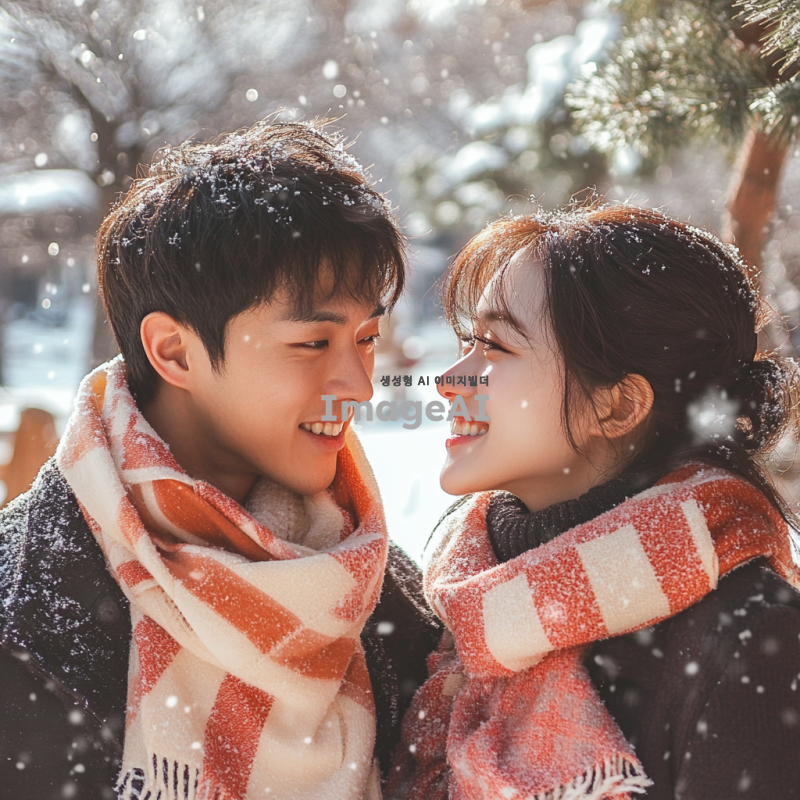 따뜻한 겨울 배경, 눈이 내리는 공원, 두 명의 한국인 연인이 서로를 바라보며 웃고 있음, 서로의 목에 커플 목도리를 메주고 있는 장면, 목도리는 빨간색과 크림색의 체크무늬, 연인의 표정은 행복하고 사랑스러움, 주변에는 눈 덮인 나무와 벤치, 부드러운 겨울 햇살이 비치는 분위기, 로맨틱하고 포근한 느낌.