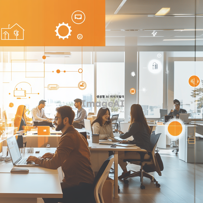 홈앤서비스의 로고와 함께 밝고 친근한 분위기의 사무실 배경, SK브로드밴드와 ADT 캡스의 상징적인 요소들이 조화롭게 배치된 모습, 직원들이 활기차고 열정적으로 일하는 장면, 따뜻한 색감과 심플한 디자인, 행복과 책임감을 표현하는 미소 짓는 직원들, 기술과 보안 서비스의 조화를 상징하는 아이콘들이 포함된 이미지.