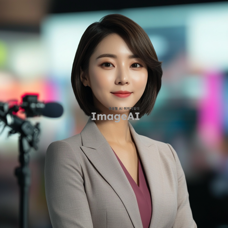 뉴스 스튜디오 배경, 단정한 단발머리의 한국인 여성 뉴스 진행자, 얼굴만 최대한 크게 나오게 깔끔한 정장 차림, 차분한 미소, 카메라를 바라보는 모습, 전문적이고 신뢰감 있는 분위기, 조명이 잘 맞춰진 스튜디오 환경, 고급스러운 느낌의 마이크 배치.