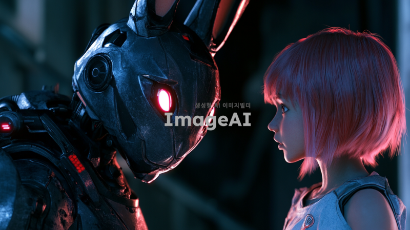 어두운 배경 속에 분홍색 단발 머리를 가진 여자 아이가 슬픈 표정으로 토끼 외형의 전투형 로봇과 얼굴을 맞대고 있다. 로봇은 금속 질감의 몸체에 부드러운 토끼 귀를 가지고 있으며, 눈은 LED처럼 빛나고 있다. 두 캐릭터는 서로의 감정을 공유하며 깊은 대화를 나누는 듯한 분위기다. 장면은 감정적이고 애틋한 분위기로, 배경은 흐릿하게 처리되어 두 캐릭터에 집중할 수 있도록 한다.