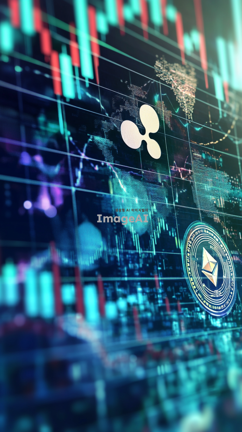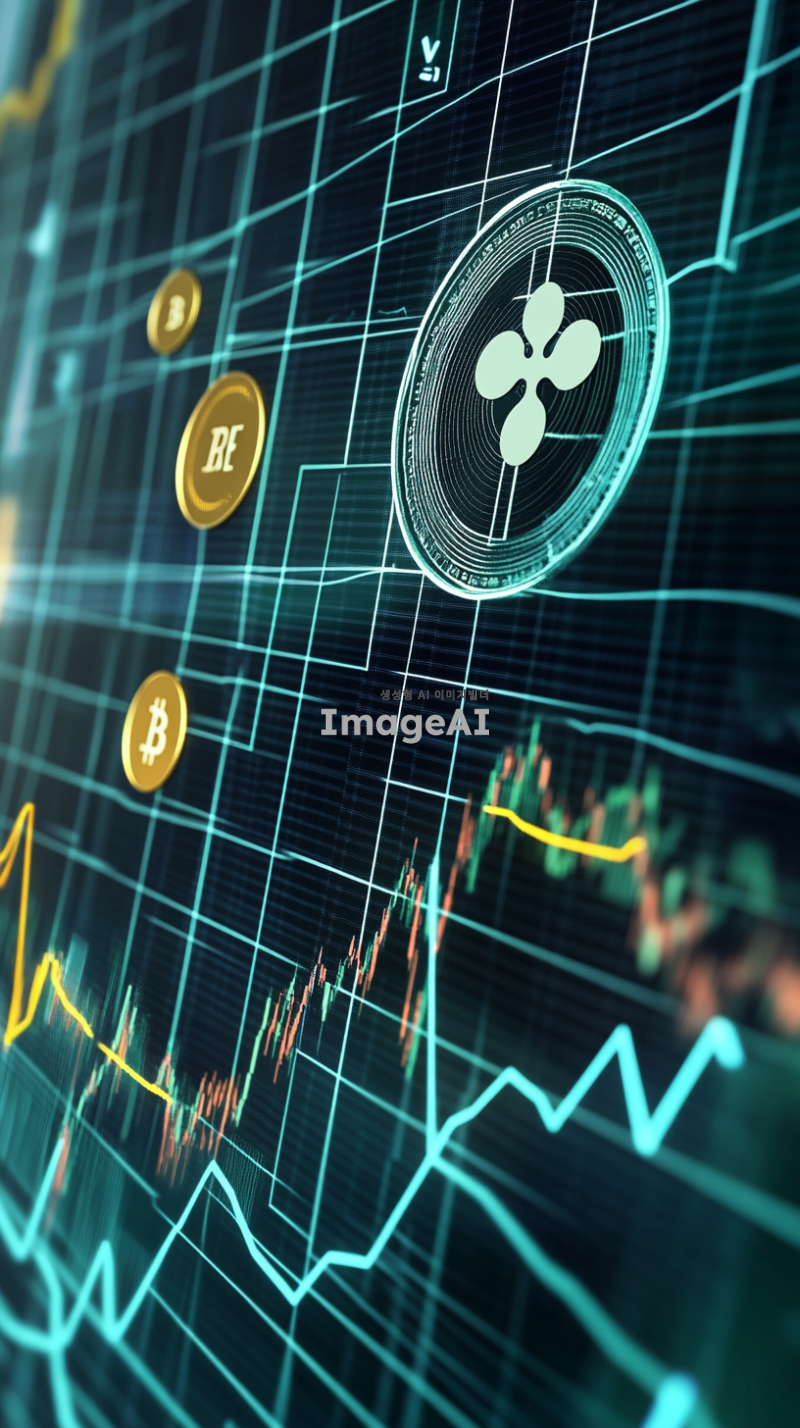 암호화폐 차트 위에서 리플코인이 다른 알트코인들을 제치고 1등으로 올라가는 장면, 리플코인 로고가 차트 상단에 크게 강조되어 보이는 모습, 차트는 디지털 스타일로 표현되고, 리플코인의 상승세가 돋보이도록 역동적인 그래프 라인, 주변의 다른 알트코인 로고들은 작고 희미하게 나타남, 배경은 미래적인 금융 시장 분위기, 블루와 그린 컬러 톤 강조