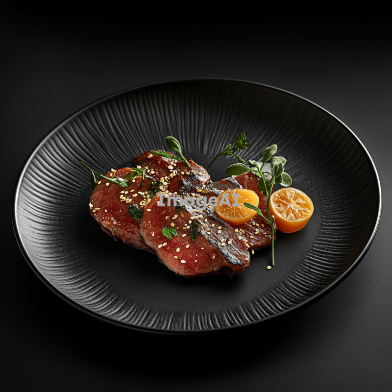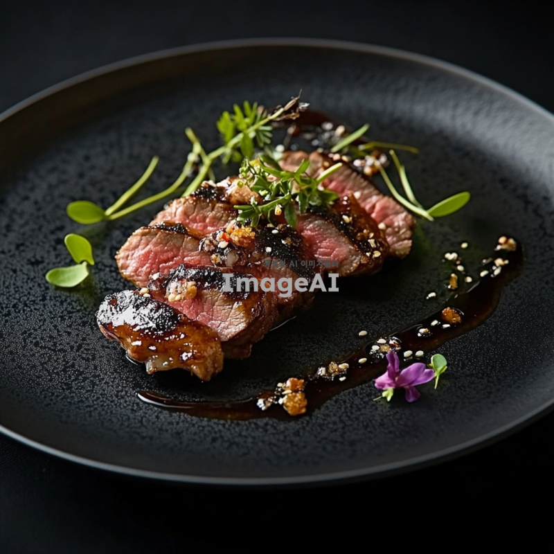 검정 접시 위에 올려진 한우 살치살, 고급스러운 분위기, 살치살의 선명한 마블링, 육즙이 풍부하게 표현된 모습, 접시 주변에 간단한 허브 장식, 자연광이 비추는 느낌, 음식 촬영 스타일, 미식가를 위한 정교한 프레젠테이션.