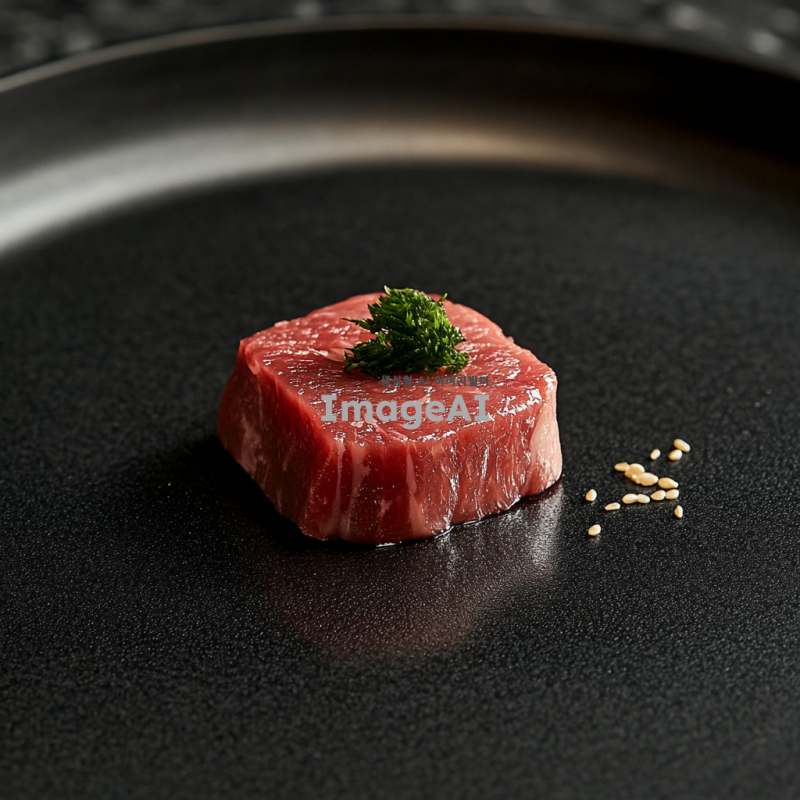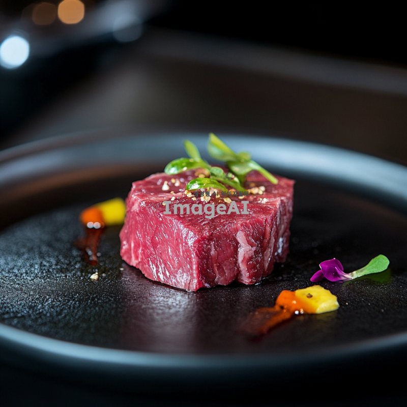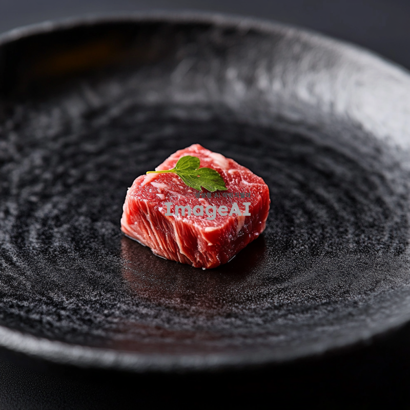 고급스러운 검정 접시 위에 굽기전 한우 살치살 한입크기 조명은 밝고 부드럽게 설정되어 음식의 질감을 강조한다.