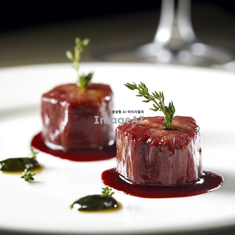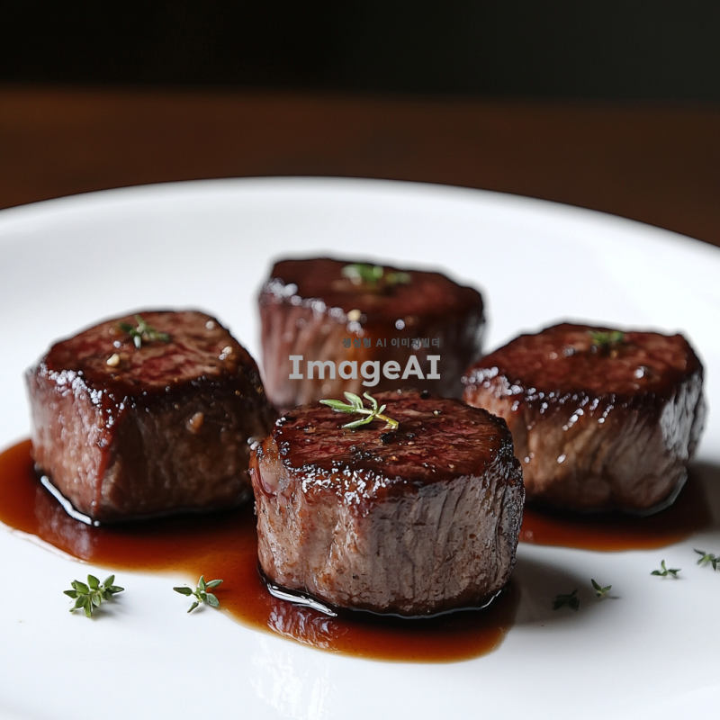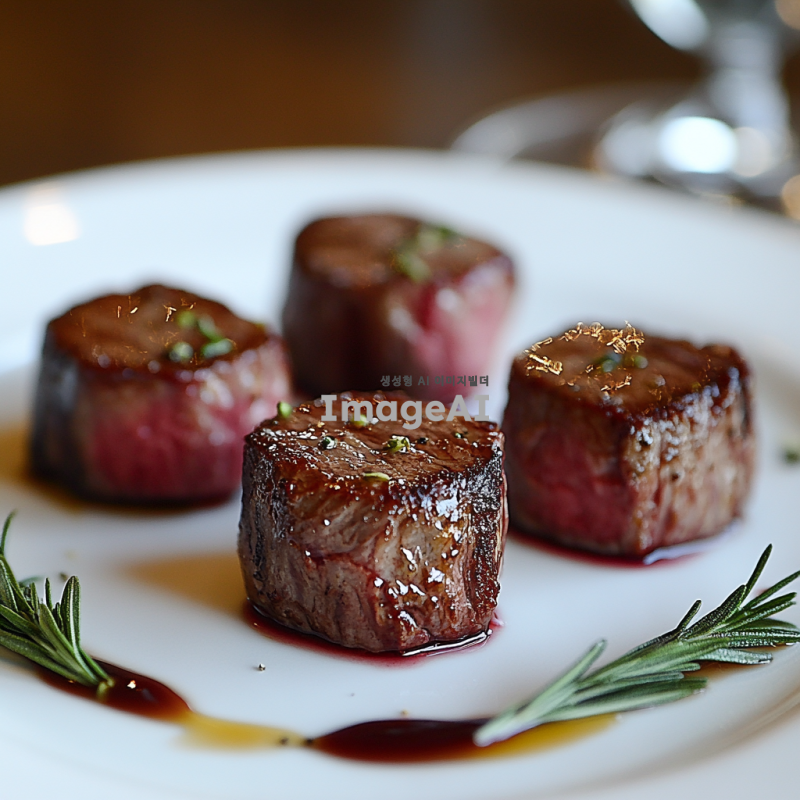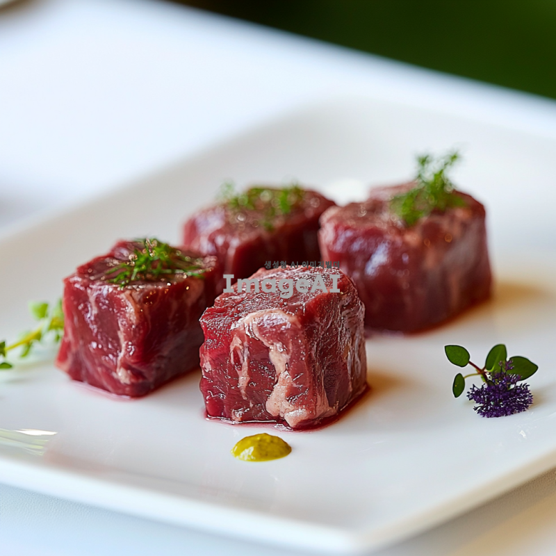 고급스러운 식탁 위에 놓인 한입 크기의 살치 생고기 세점, 고기는 신선하고 붉은 색을 띄며, 육즙이 가득 차 윤기가 흐르는 모습, 고기의 결이 잘 드러나도록 조명은 부드럽고 자연스럽게 설정, 배경은 심플하게 하여 고기가 돋보이도록 연출, 접시는 세련된 흰색 도자기 접시로 설정, 주변에 간단한 허브 장식 추가.