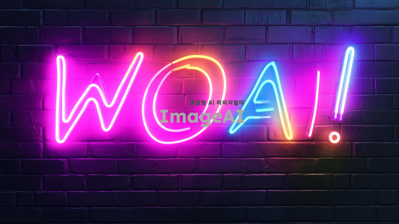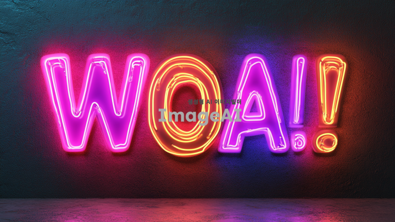 WOW! Damoa AI !! 글귀를 네온사인 스타일로 표현, 어두운 배경 위에 밝고 생동감 있는 네온 컬러 사용, 글자 주변에 은은한 빛 번짐 효과 추가, 현대적이고 세련된 느낌, 도시의 밤을 연상케 하는 분위기, 글자 크기는 큼지막하게, 네온사인의 질감을 사실적으로 표현, 글씨체는 부드럽고 유려한 스타일.