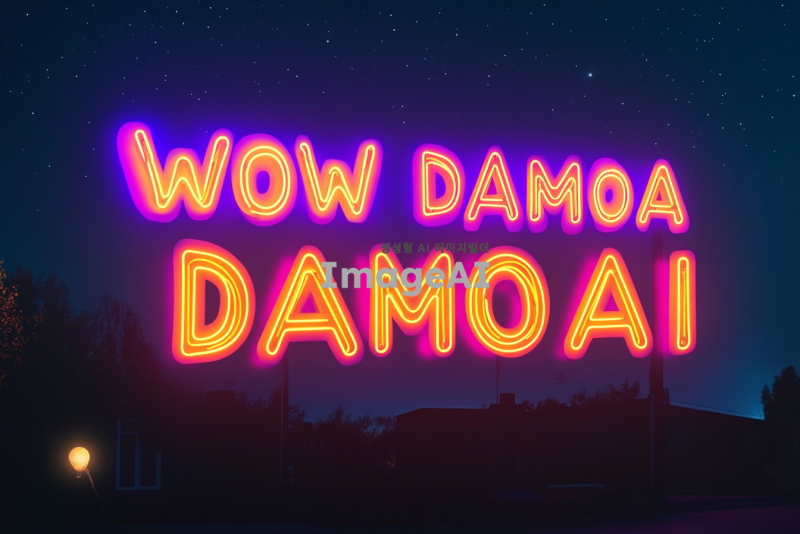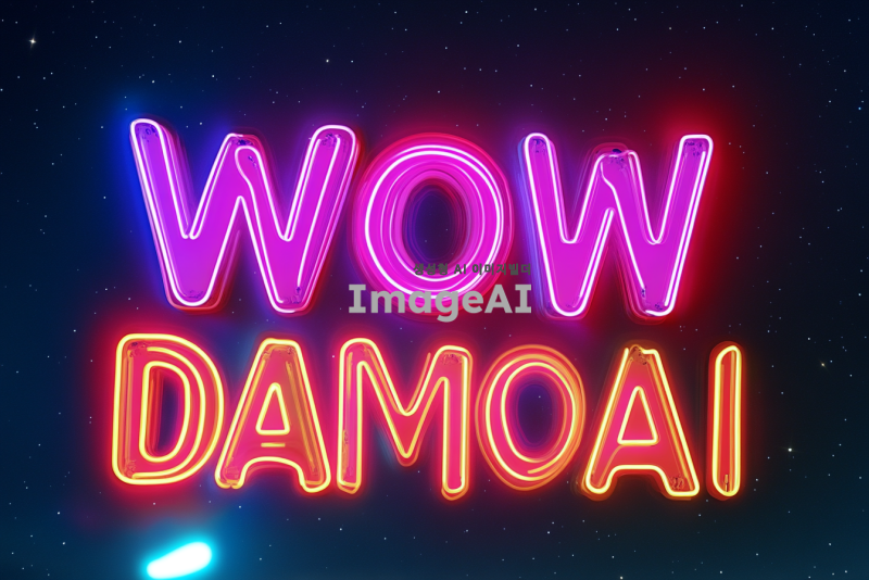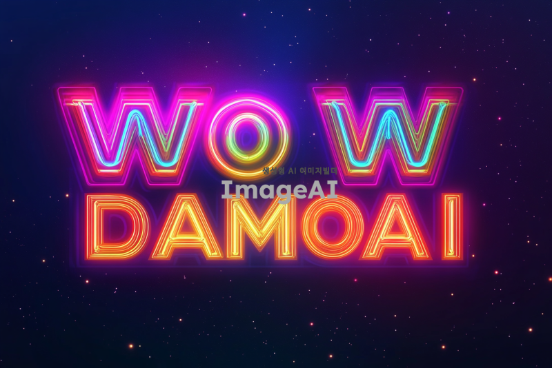 네온사인 스타일로 "WOW DAMOA AI"라는 글귀가 밤하늘을 배경으로 빛나고 있는 이미지. 네온사인은 밝고 다채로운 색상으로 빛나며, 글자 주변에 약간의 빛 번짐 효과가 있어 더욱 생동감 있게 표현됨. 글자 크기는 크고 굵게 디자인되어 멀리서도 쉽게 읽히며, 배경은 별이 반짝이는 어두운 밤하늘로 설정되어 네온사인이 더욱 돋보임.