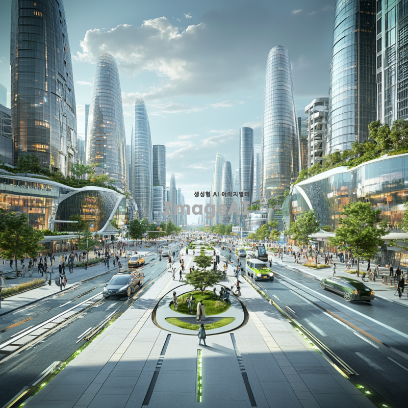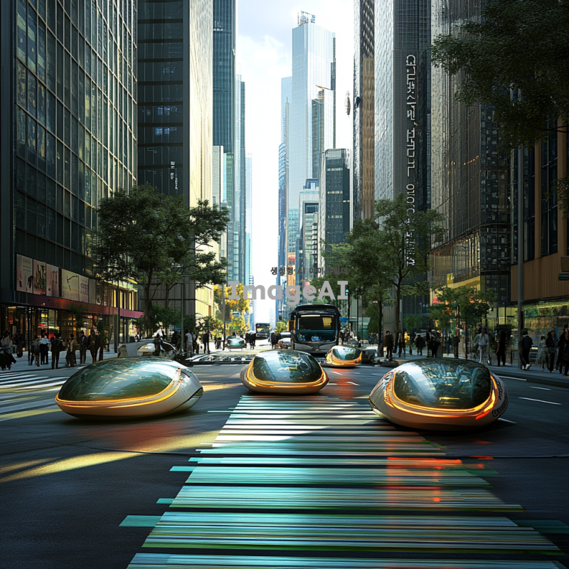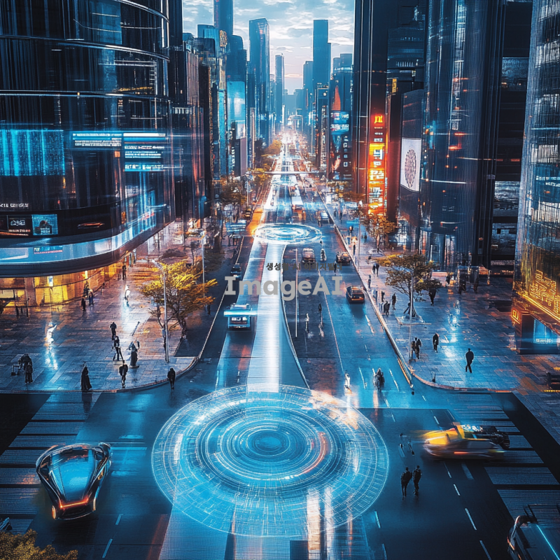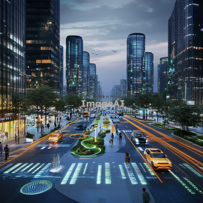 2050년 미래 사회의 스마트 시티 배경, 횡단보도에 압전효과가 적용된 모습, 현대적이고 세련된 도시 풍경, 초고층 빌딩과 녹색 공간이 조화를 이루는 거리, 횡단보도 밑에는 압전 기술로 에너지를 생성하는 장치가 설치되어 있으며, 사람들이 횡단보도를 건널 때마다 빛이 나는 효과, 미래적인 디자인의 교통 신호등과 차량, 깨끗하고 안전한 도시 환경, 첨단 기술이 일상에 스며든 모습, 한국인의 일상적인 모습이 자연스럽게 어우러진 장면.
