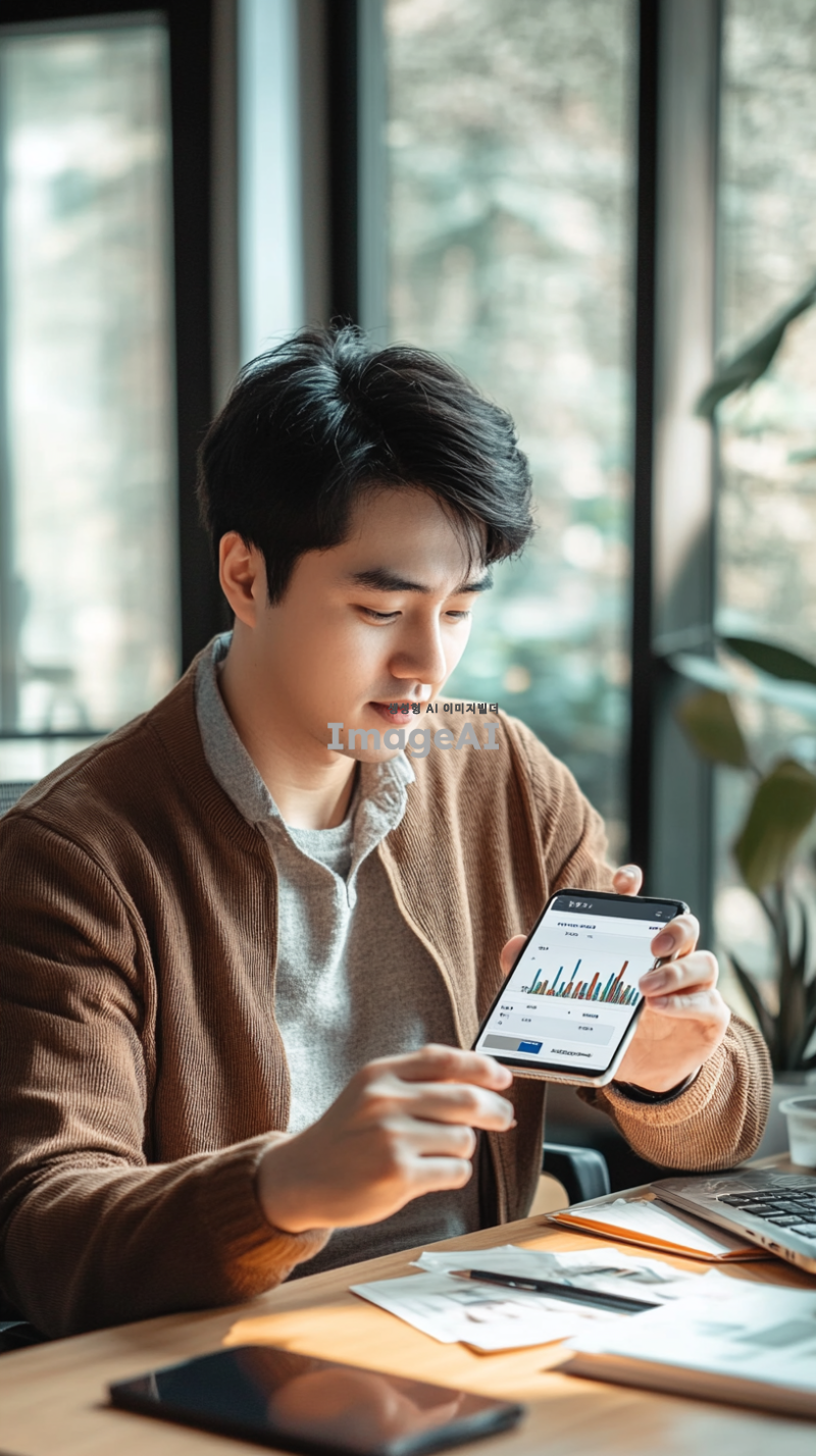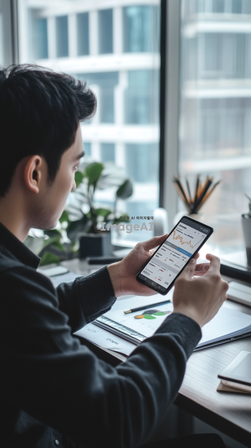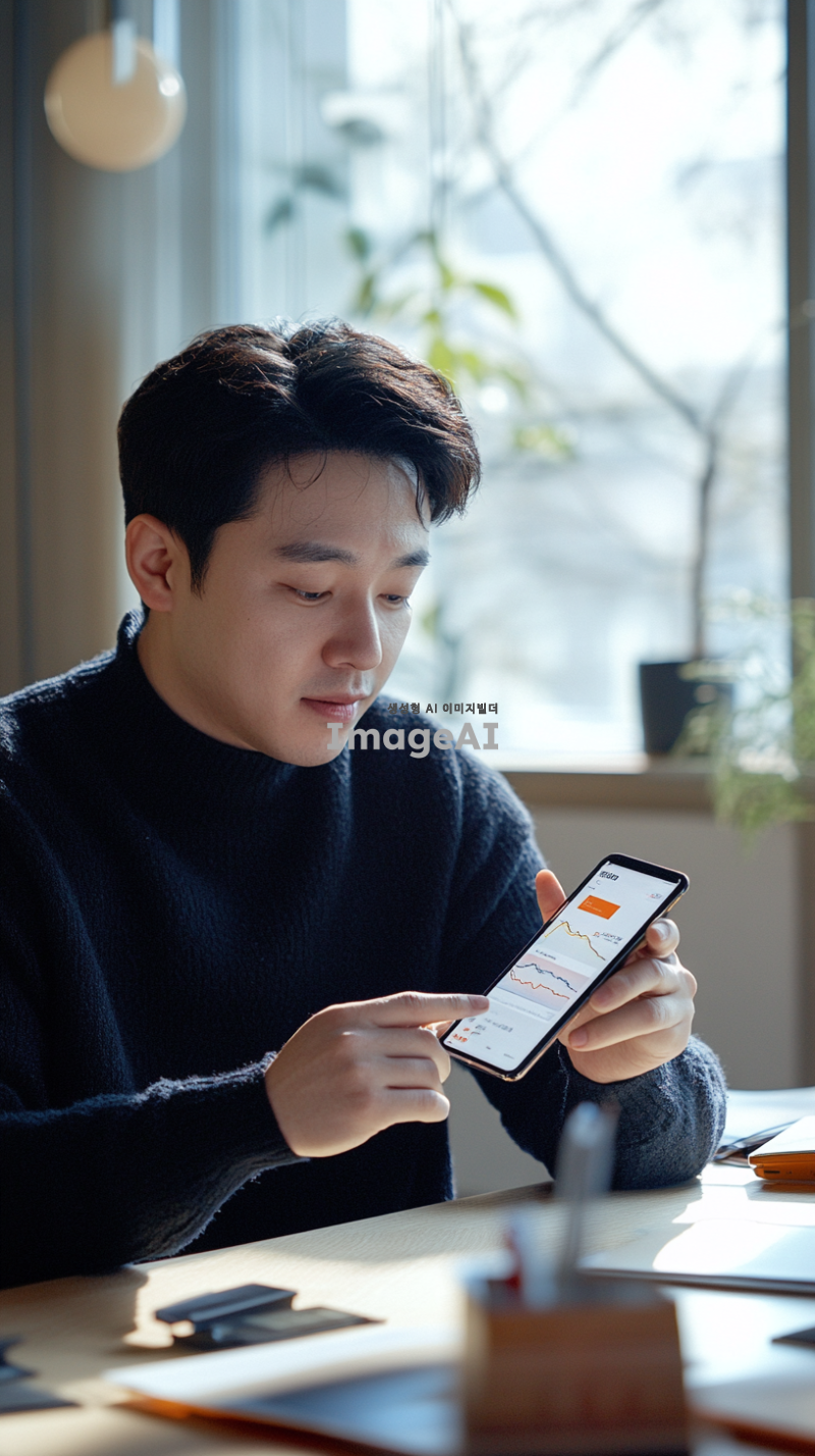 한국인 남성이 현대적인 디자인의 사무실 책상에 앉아 있으며, 손가락으로 스마트폰 화면의 코인 매수 버튼을 누르고 있다. 스마트폰 화면은 밝게 빛나고 있으며, 화면에 코인 그래프와 매수 버튼이 강조되어 보인다. 남성은 집중한 표정으로 화면을 바라보고 있으며, 주변에는 깔끔한 사무실 용품이 놓여 있다. 자연광이 창문을 통해 들어와 방 안을 밝히고 있다.
