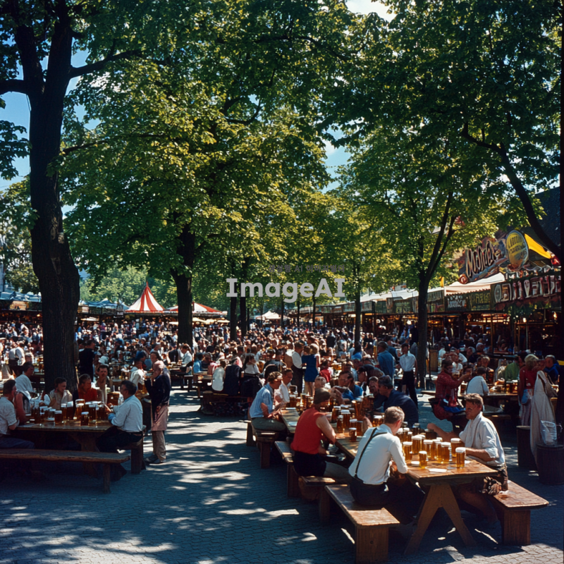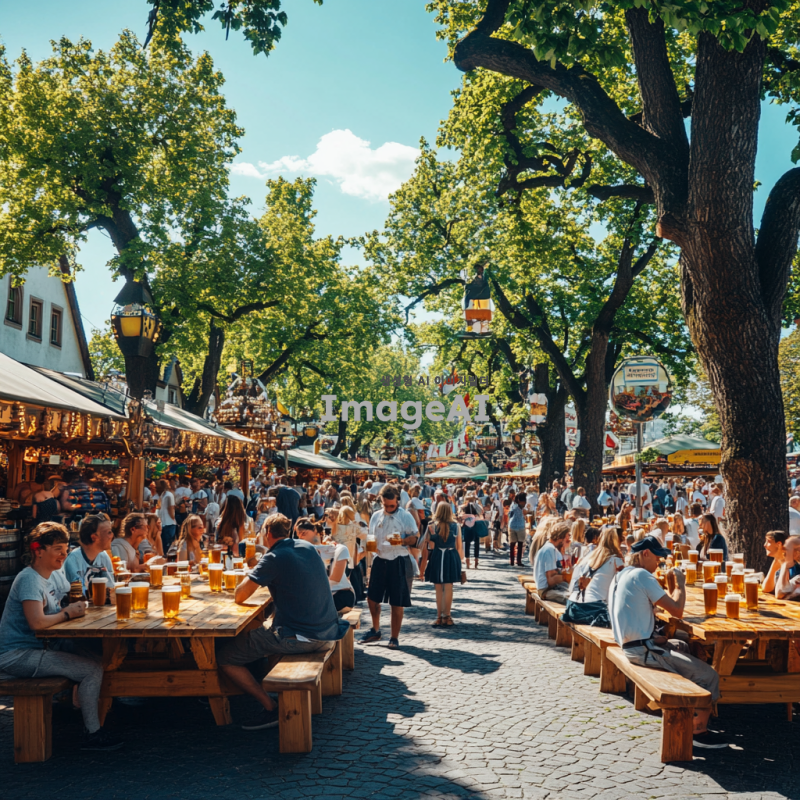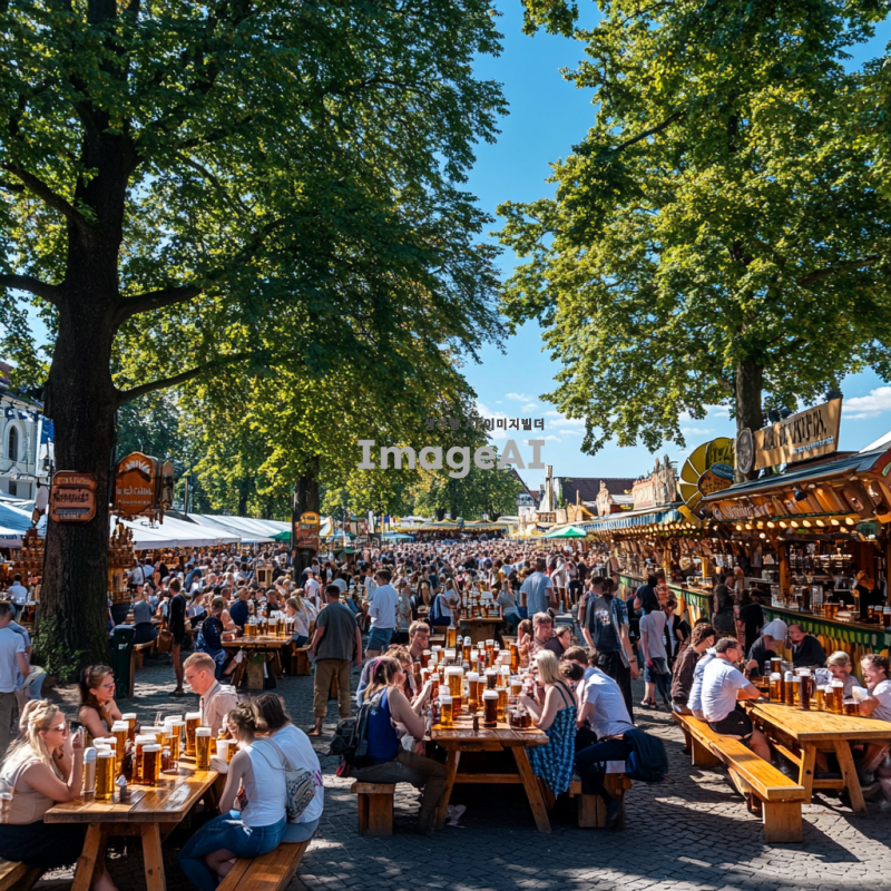 독일 전통 맥주 축제가 열리는 넓은 광장, 여러 개의 큰 맥주 텐트가 줄지어 있고, 각 텐트 앞에는 다양한 독일 맥주가 가득 찬 긴 테이블이 놓여 있다. 테이블 주변에는 전통 독일 의상을 입은 사람들이 맥주를 즐기며 웃고 있다. 주변에는 커다란 나무들이 줄지어 서 있고, 맥주 잔을 들고 있는 사람들의 환한 얼굴이 보인다. 광장 한편에는 전통 독일 음식인 소시지와 프레첼을 파는 작은 매대가 있으며, 그 위로는 푸른 하늘이 펼쳐져 있다.