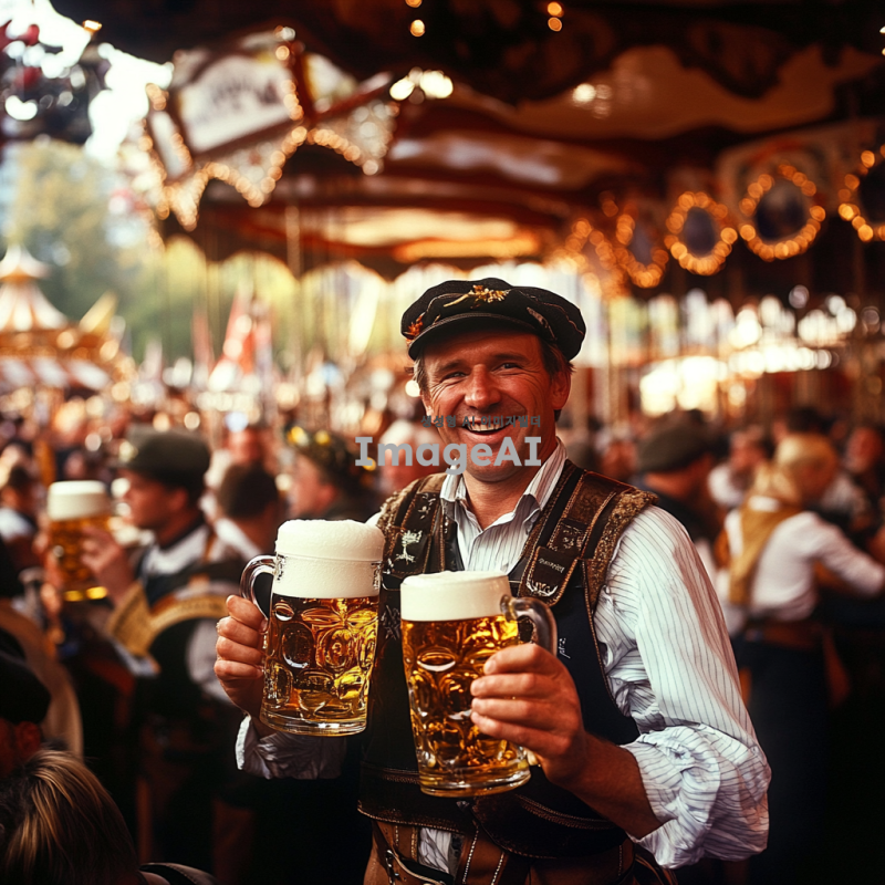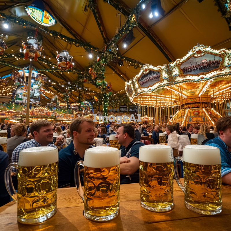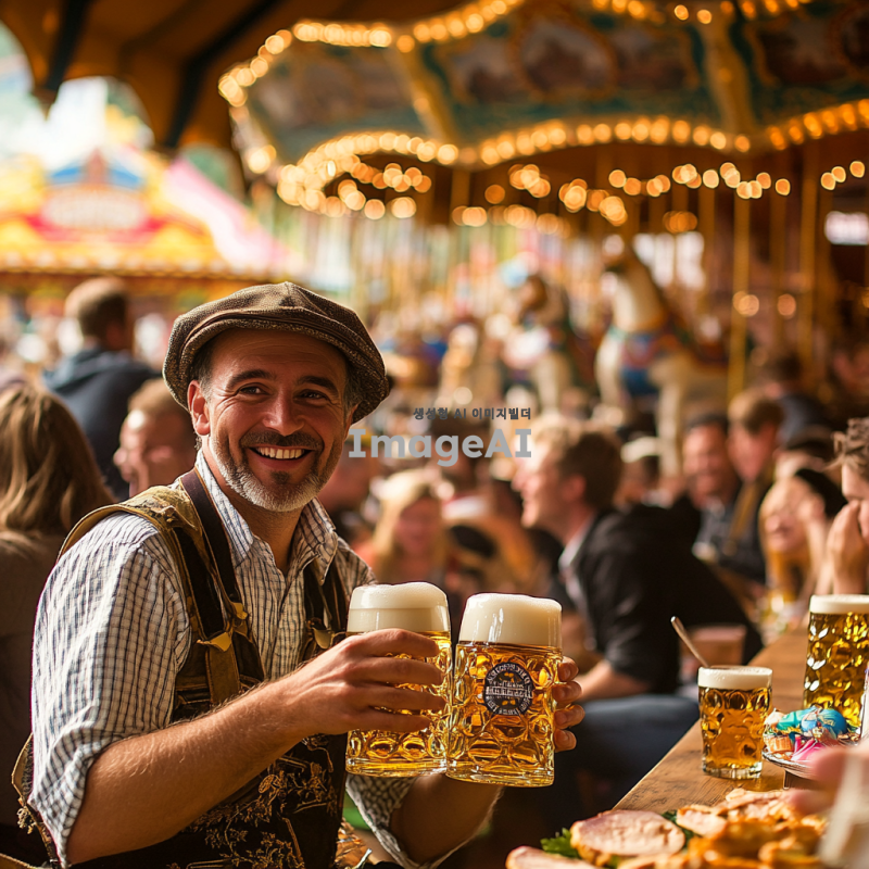 독일 뮌헨의 옥토버페스트 축제 현장, 전통적인 독일 맥주 텐트 내부, 커다란 맥주잔을 들고 즐거워하는 사람들, 전통적인 바이에른 의상을 입은 남성과 여성, 활기찬 분위기, 다양한 독일 음식과 장식들, 배경에는 축제의 상징적인 회전목마와 놀이기구, 가을의 따뜻한 색감.