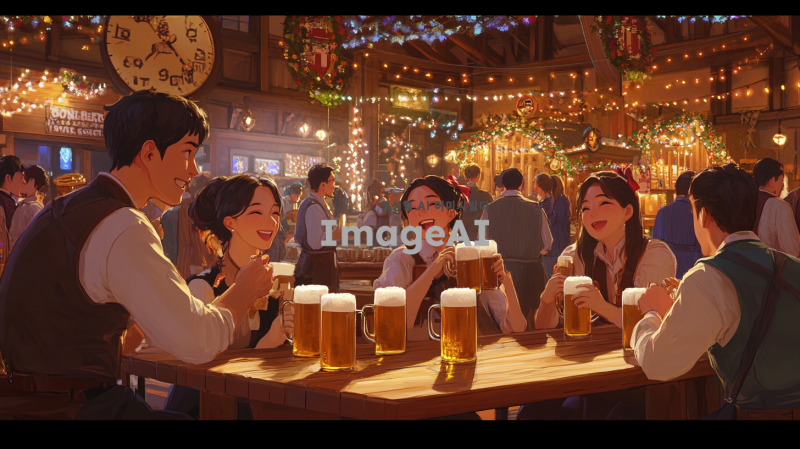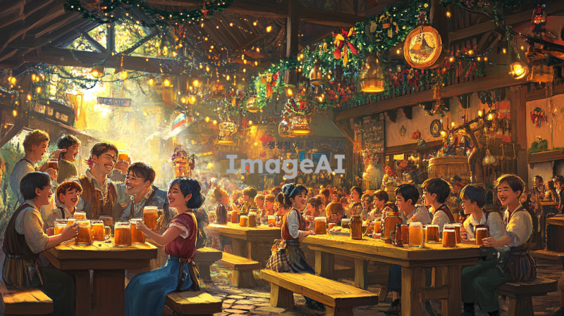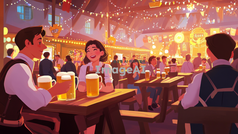 옥토버페스트를 배경으로 한 활기찬 맥주 축제 장면. 전통적인 독일 바이에른 스타일의 맥주 텐트 내부, 긴 나무 테이블과 벤치에 앉아 있는 다양한 연령대의 한국인 방문객들, 독일 전통 의상인 디른들과 레더호젠을 입고 있는 사람들, 큰 맥주잔을 들고 웃고 있는 모습, 배경에는 풍성한 장식과 화려한 조명이 어우러진 축제 분위기, 무대에서 연주하는 전통 독일 음악 밴드, 주변에는 다양한 독일 전통 음식과 간식들이 진열된 모습.