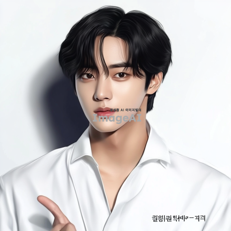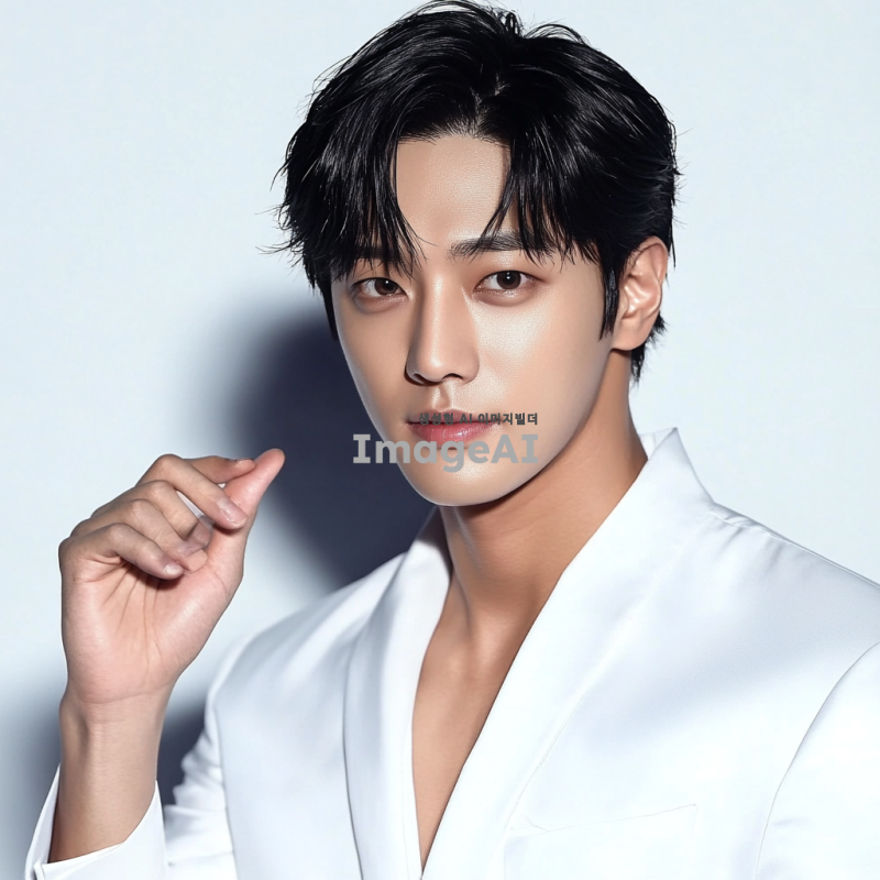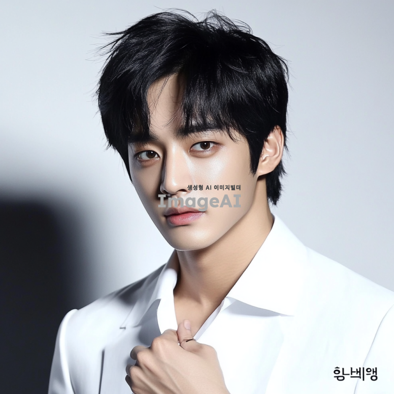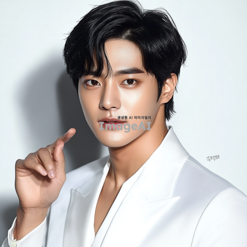 현실적인 사진, 흑발에 흰색 셔츠를 입고 흰 배경에서 머리를 쓸어넘 포즈를 취하고 있는 한국 남자의 사진. 그는 매우 잘생기고 아이돌 같은 외모를 가지고 있으며, 젊은 얼굴과 귀여운 미소를 짓고 있다. 그의 날카로운 눈은 반짝이며 자신감 있어 보인다. 그는 K-pop 스타를 연상시키는 검은색의 헤어스타일을 하고 있다.맑은 눈으로 정면또는 측면을 바라보고 있다.