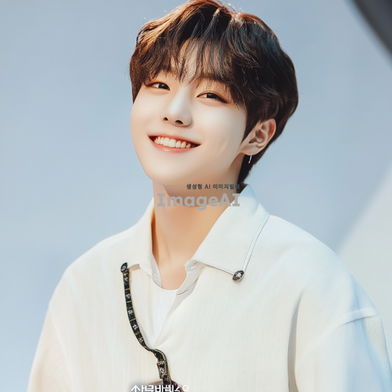 k-pop 아이돌스러운 하얗고, 귀여운 얼굴의 한국 고등학생 남자, 청량하게 웃고 있으며 흰색 셔츠를 입고 흰색 배경 앞에 서있다. 입덕멤버이다.
