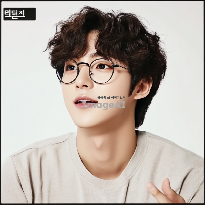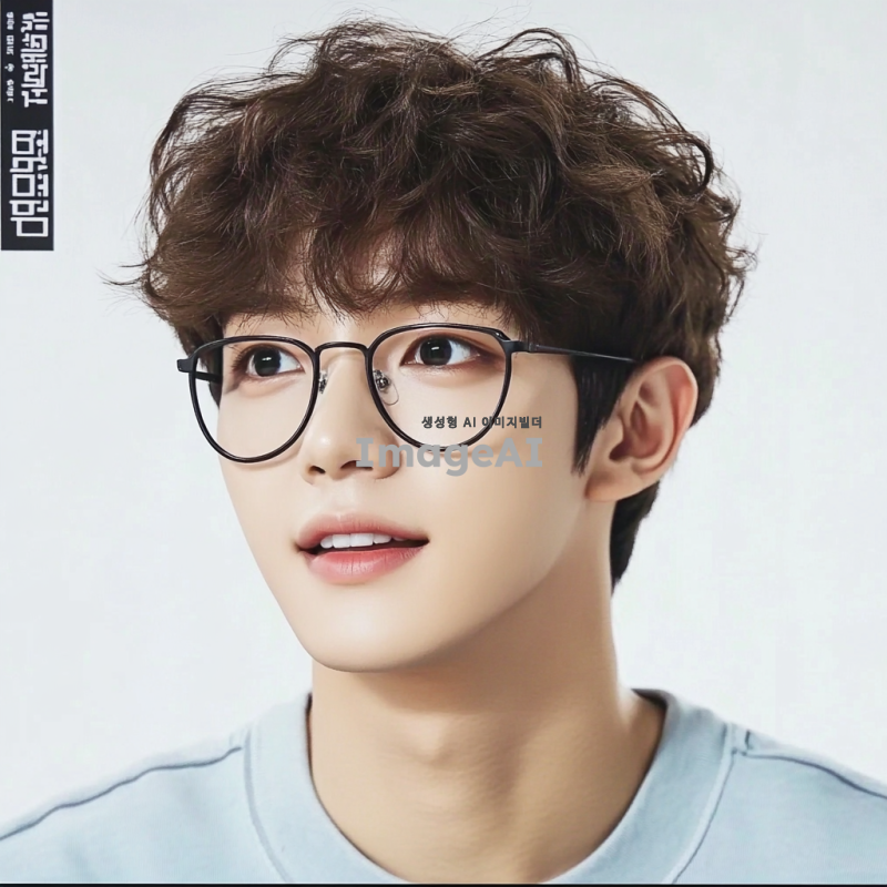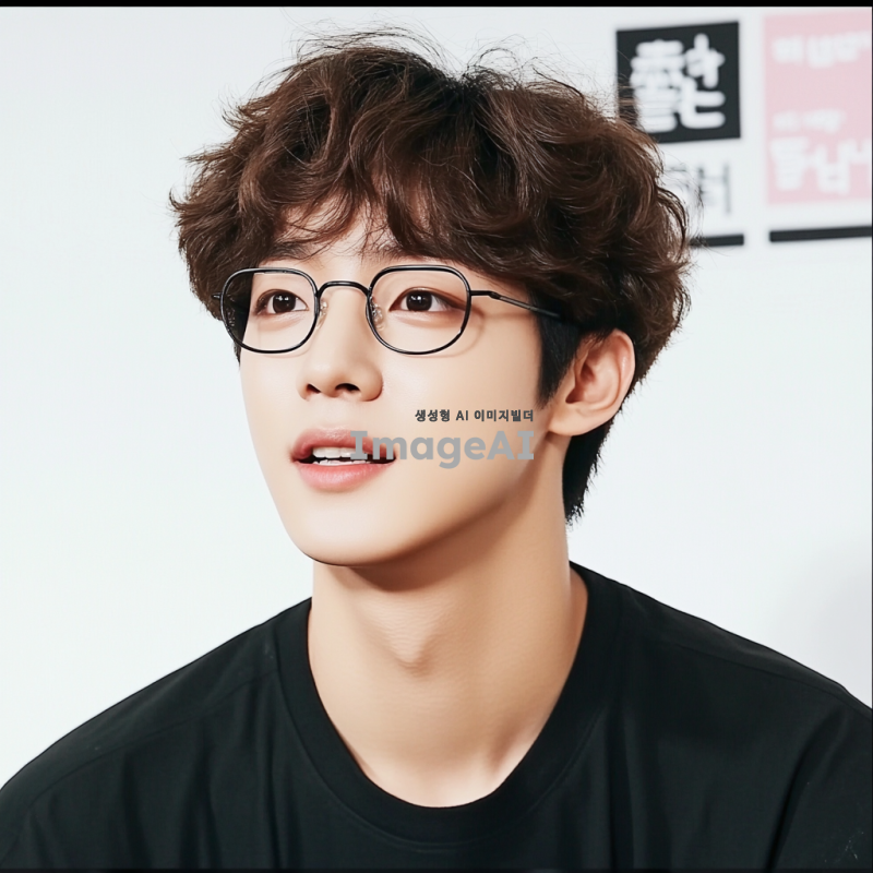 검은 머리를 가진 젊은 k-pop 아이돌 남자가 셔츠를 입고, 흰색 배경앞에서 포즈를 취하고 있다. 그는 짧은 곱슬머리를 하고 있고, 그는 미소 짓고 있다. 그는 잘생겼고, 귀여우며, 검은 뿔테 안경을 쓰고 있다.