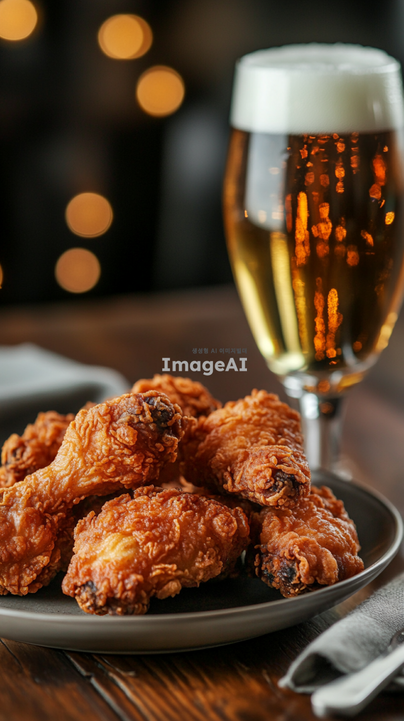 따뜻한 조명 아래 나무 식탁 위에 놓인 바삭한 후라이드 치킨과 시원한 맥주. 치킨은 황금빛으로 튀겨져 있으며, 바삭한 껍질이 돋보인다. 맥주는 투명한 유리잔에 담겨 있으며, 잔 위로 하얀 거품이 풍성하게 올라와 있다. 주변에는 간단한 식기와 냅킨이 놓여져 있어 식사의 분위기를 더한다.