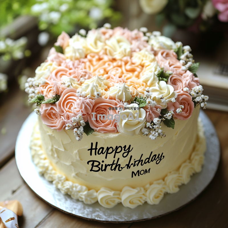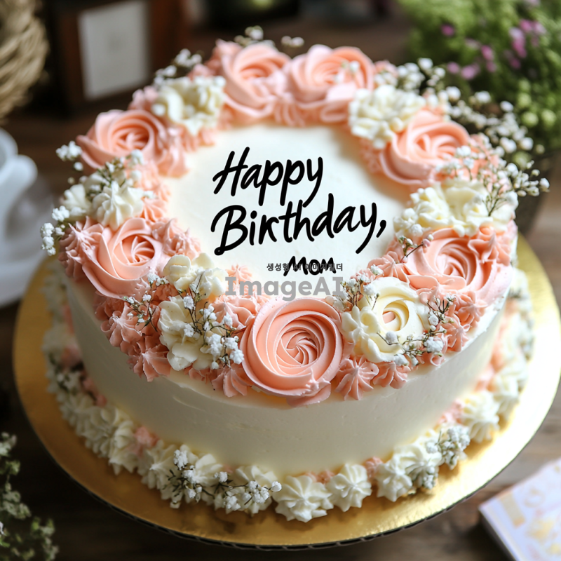 1호 사이즈 케이크, 흰색꽃과 분홍색꽃으로 아름답게 장식된 디자인, 케이크 표면에 "Happy Birthday, MOM"이라는 검은색 글자, 전체적으로 우아하고 사랑스러운 분위기, 한국 스타일의 케이크 디자인.