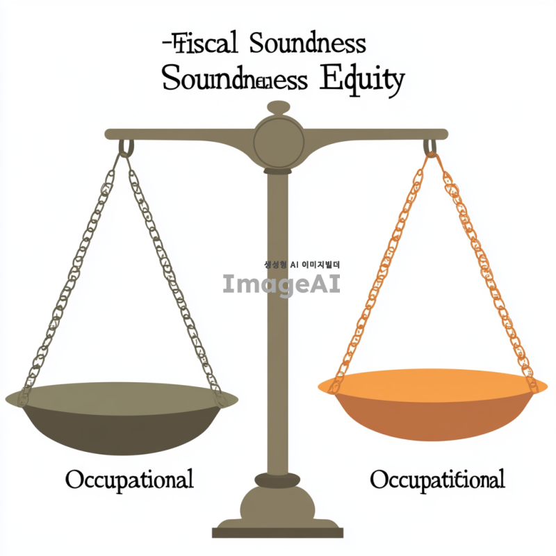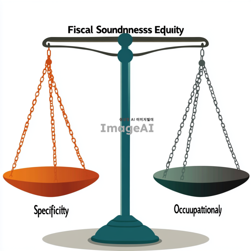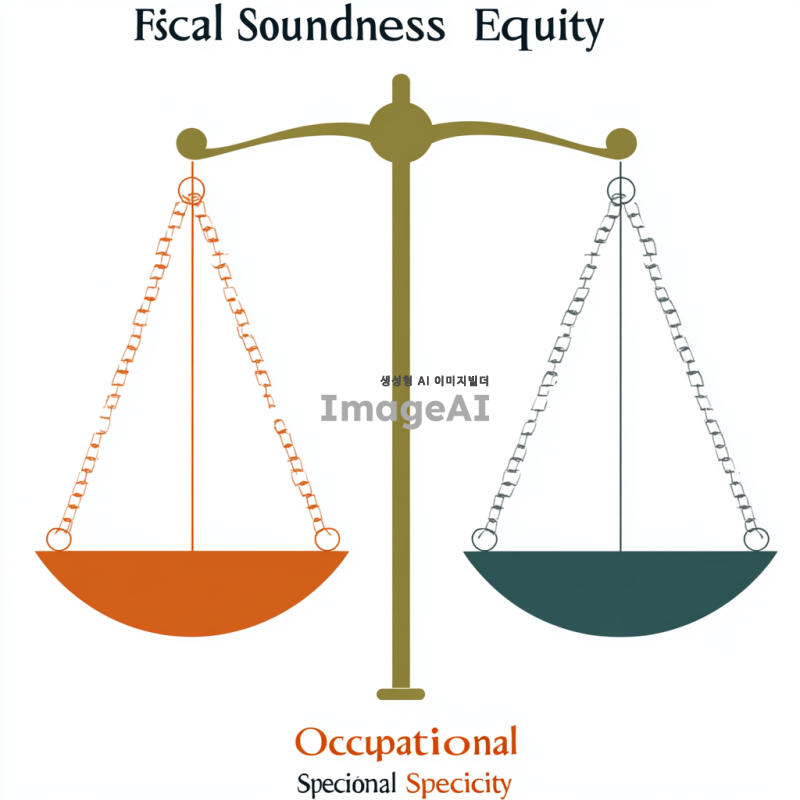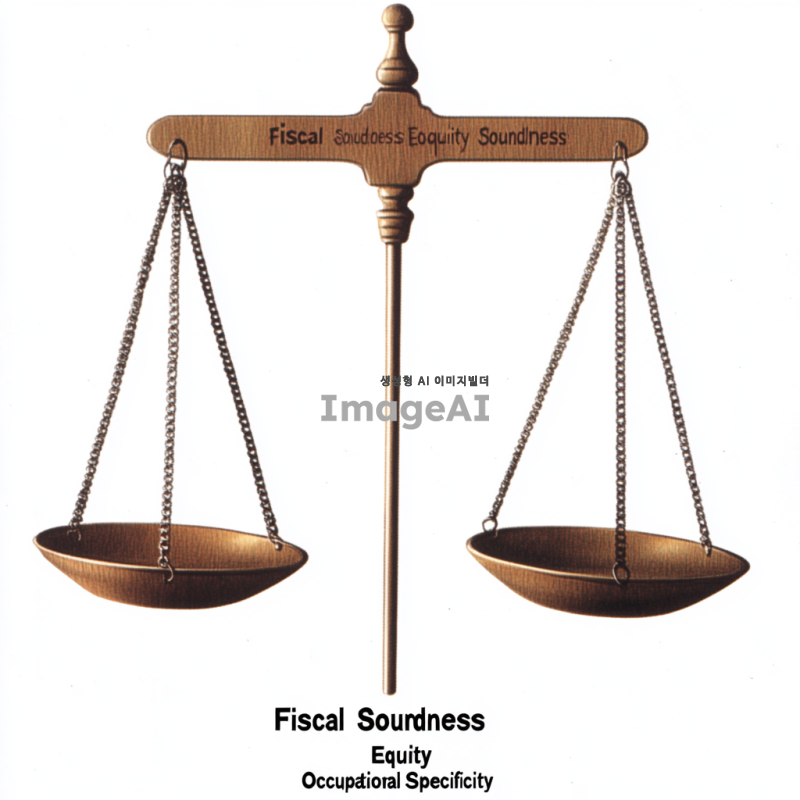 세 개의 저울이 나란히 놓여 있는 장면. 첫 번째 저울은 '재정건정성'이라는 라벨이 붙어 있으며, 무게추가 균형을 이루고 있는 모습. 두 번째 저울은 '형평성'이라는 라벨과 함께 한쪽으로 기울어져 있는 모습. 세 번째 저울은 '직업적 특수성'이라는 라벨이 붙어 있으며, 무게추가 불안정하게 흔들리는 모습. 저울들은 각각 다른 색상으로 구분되어 있으며, 배경은 심플한 흰색.
