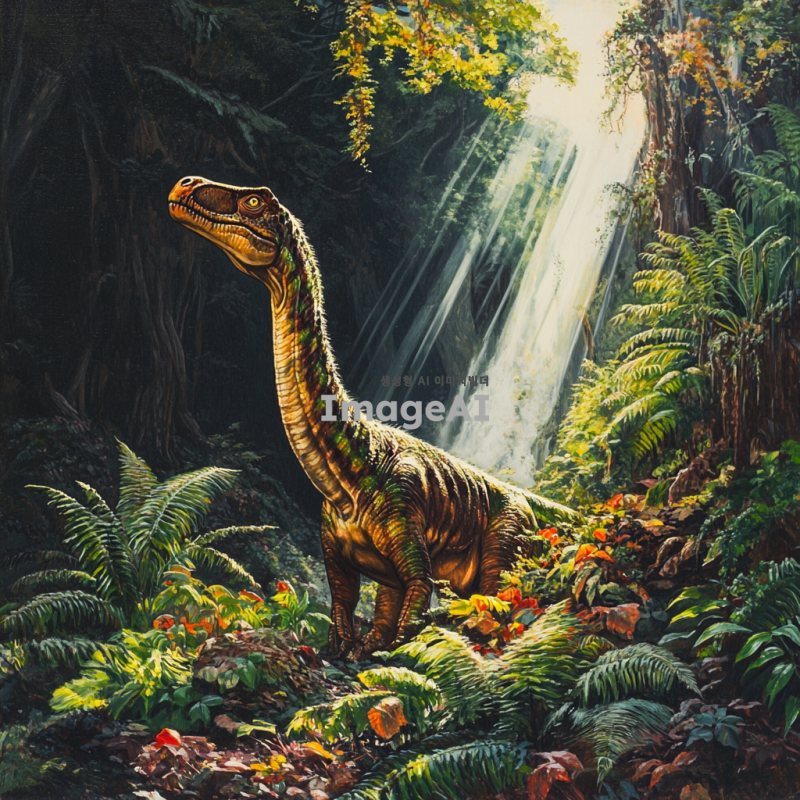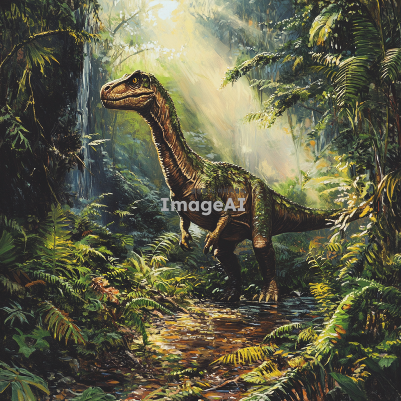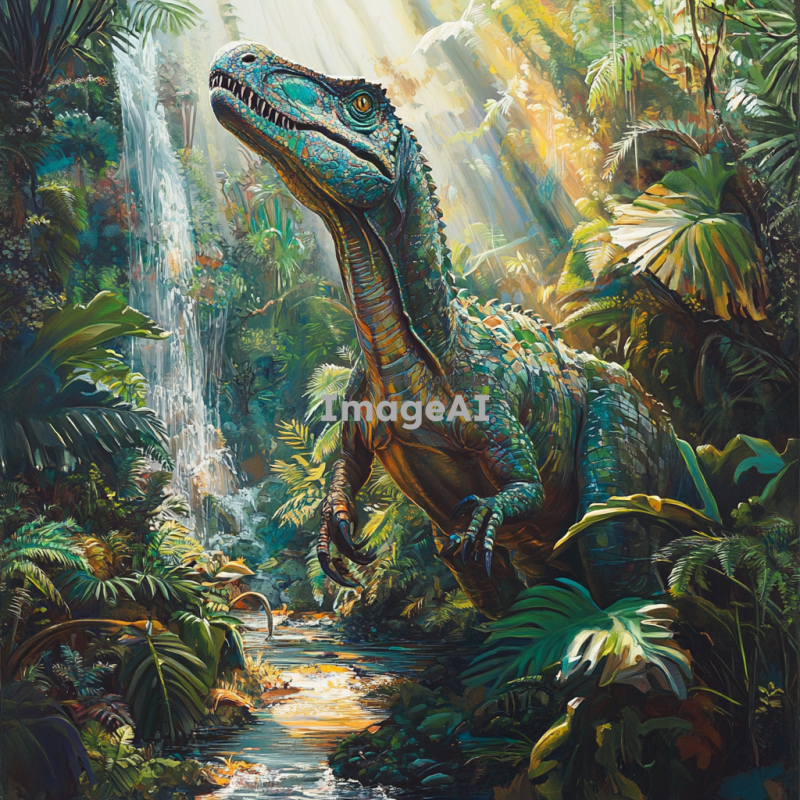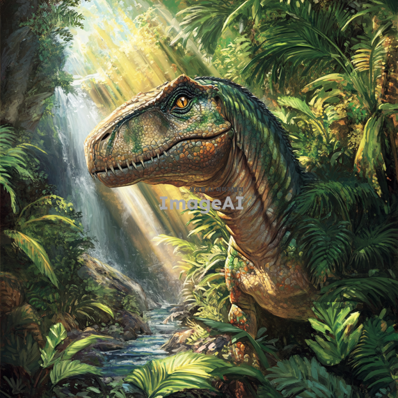 타이노사우르스가 울창한 정글 속에서 고개를 치켜들고 있는 모습, 햇빛이 나뭇잎 사이로 비쳐 타이노사우르스의 비늘 위에 반짝이는 장면, 주변에는 다양한 열대 식물이 가득하고, 멀리서 작은 폭포가 흐르는 소리가 들리는 듯한 배경, 타이노사우르스의 피부는 생생한 녹색과 갈색의 조화로 이루어져 있으며, 강력하고 위엄 있는 모습으로 묘사.