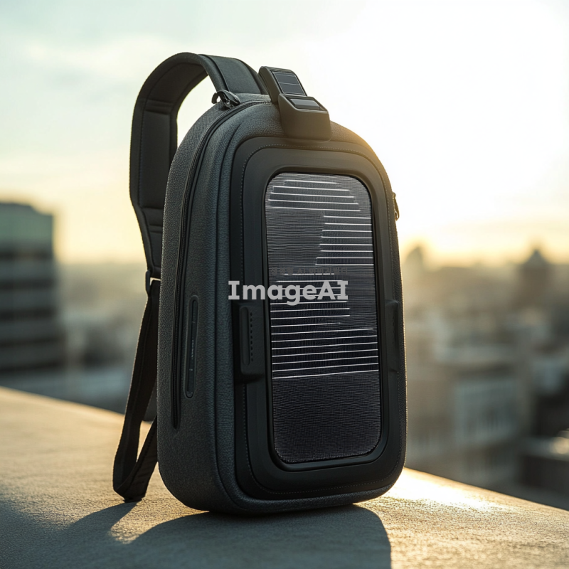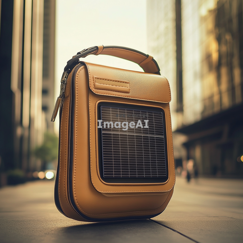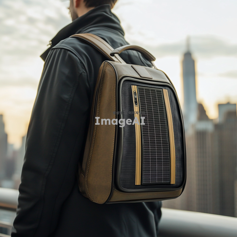 현대적이고 세련된 디자인의 숄더백, 태양열 패널이 상단에 장착되어 충전 기능을 제공, 방수 소재로 제작된 수납공간, 시원하게 음료를 보관할 수 있는 내부 공간, 고급스러운 마감과 정교한 디테일, 도시적인 배경에서 사용 중인 모습, 자연광 아래에서 태양열 패널이 빛을 받는 장면, 실용적이면서도 스타일리시한 느낌 강조.