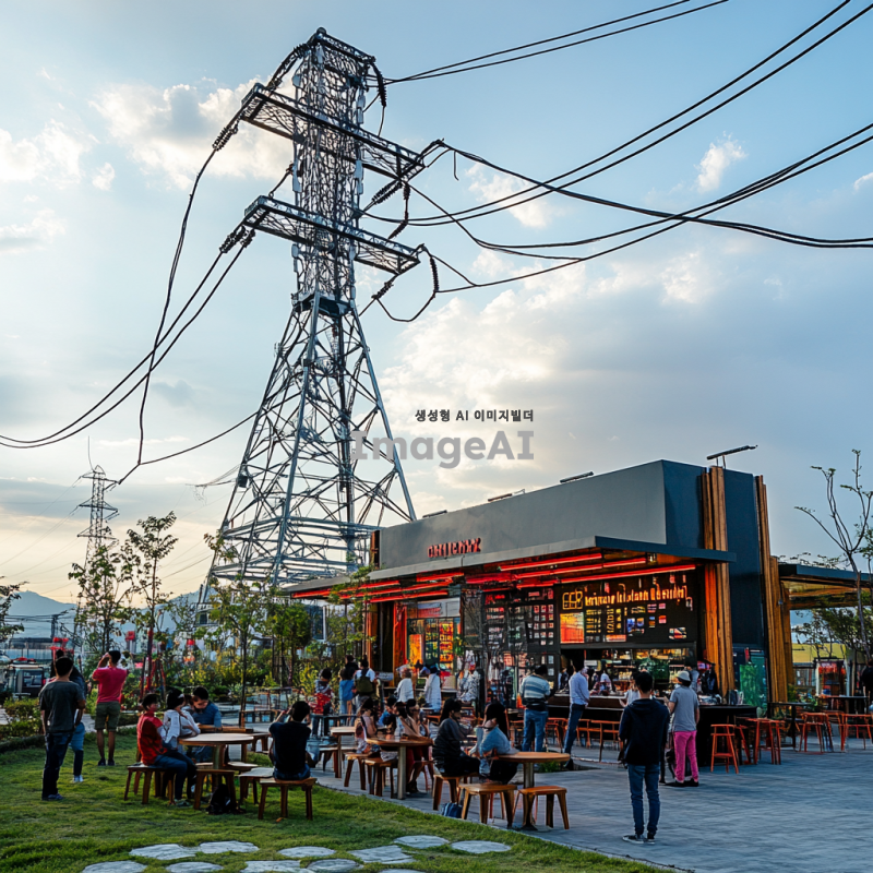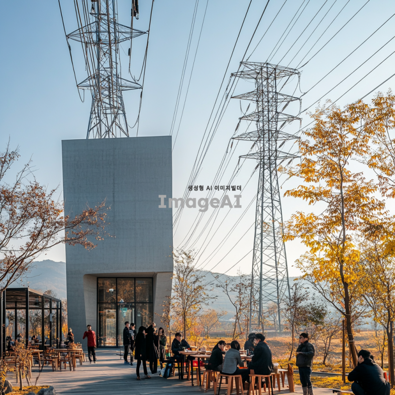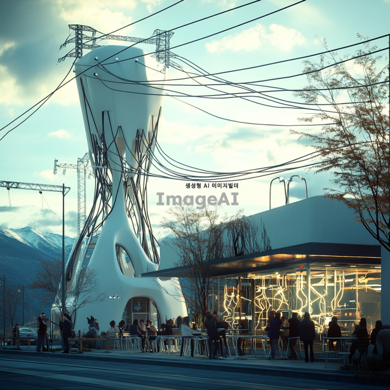 미래지향적이고 예술적인 외관을 가진 랜드마크형 변전소 건물, 전기가 흐르는 듯한 효과로 송전탑을 따라 연결된 전선, 변전소를 배경으로 사진을 촬영하는 사람들, 바로 옆 노천카페에서 커피를 마시며 여유로운 모습을 즐기는 사람들, 현대적이고 활기찬 분위기.