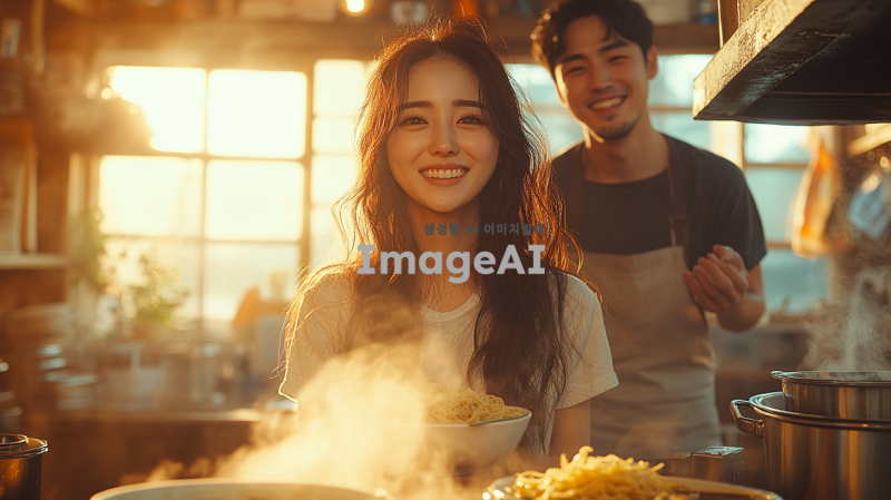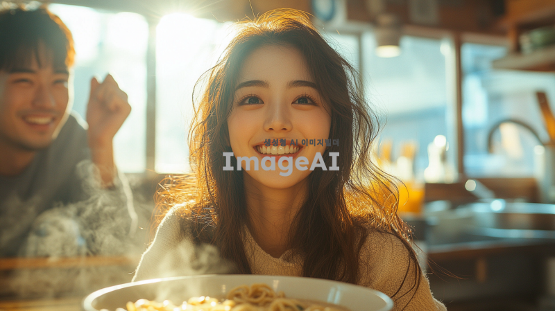 따뜻한 주방에서 라면을 먹고 있는 아내, 아내는 행복한 표정으로 라면을 즐기고 있으며, 남편은 뒤에서 무릎을 꿇고 손을 들고 있는 모습. 아내는 긴 머리를 가진 한국 여성이고, 남편은 짧은 머리를 가진 한국 남성. 주방은 현대적인 스타일로 꾸며져 있으며, 창문을 통해 햇빛이 들어오는 아늑한 분위기. 아내의 앞에는 김이 나는 라면 그릇이 놓여 있고, 남편은 웃으며 아내를 바라보고 있음.