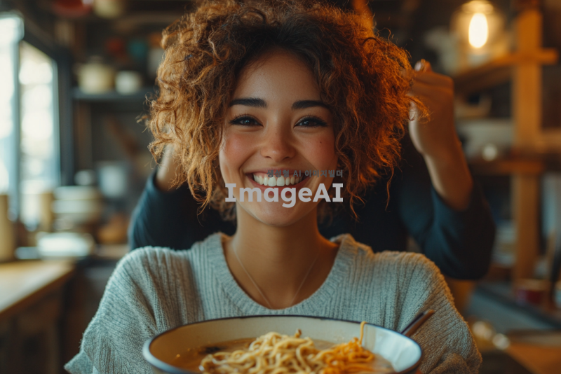 밝은 주방에서 라면을 먹으며 행복하게 웃고 있는 아내, 뒤에서 무릎을 꿇고 손을 들고 있는 남편, 아내는 짧은 머리와 캐주얼한 옷차림, 남편은 약간 당황한 표정, 따뜻하고 유쾌한 분위기, 아늑한 실내 조명, 현대적인 주방 인테리어.