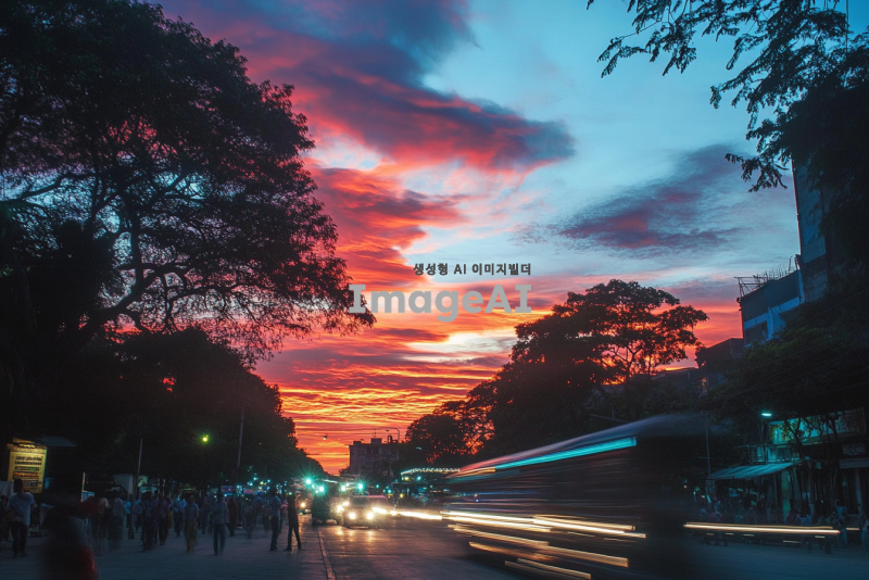 퇴근 후의 여유로운 순간을 담은 노을 타임랩스, 붉고 주황빛으로 물든 하늘과 구름, 바람에 흔들리는 나무들, 도시의 건물들이 실루엣으로 보이는 모습, 도심 속에서 바쁘게 움직이는 사람들, 점점 어두워지는 하늘과 함께 켜지는 가로등, 평화롭고 차분한 분위기, 노을이 지는 아름다운 풍경.