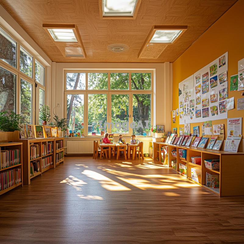 밝고 따뜻한 분위기의 가족 교육실, 노령의 부모님과 그 자녀들이 함께 모여 교육 활동에 참여하는 모습, 책과 학습 도구들이 잘 정리된 공간, 창문을 통해 자연광이 들어오는 아늑한 실내, 벽에는 교육적인 포스터와 그림들이 장식되어 있음, 따뜻함을 강조하며, 가정적인 분위기의 공간