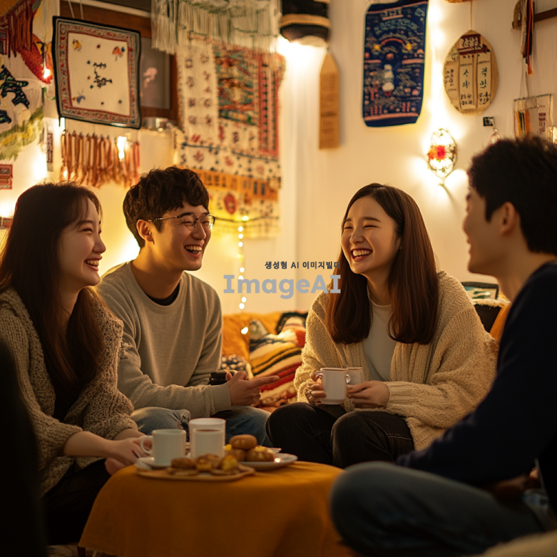 밝고 아늑한 방 안에서 외국인 두 명과 한국인 두 명이 편안하게 소파에 앉아 웃으며 대화를 나누고 있는 장면. 방은 따뜻한 조명으로 비추어져 있으며, 벽에는 다양한 문화적 요소가 담긴 장식이 걸려 있다. 테이블 위에는 커피잔과 간단한 다과가 놓여 있어 친근한 분위기를 더한다. 각 인물은 캐주얼한 복장을 하고 있으며, 서로 다른 배경을 가진 사람들이 함께 소통하는 모습이 자연스럽고 조화롭게 표현되어 있다.