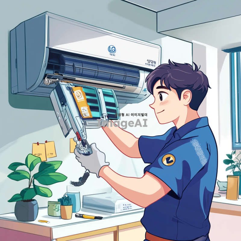 서비스센터 직원이 LG전자 로고가 있는 작업복을 입고, 에어컨을 분해하여 청소하는 장면을 묘사한 만화 스타일의 포스터. 직원은 친절하고 전문적인 표정을 짓고 있으며, 주변에는 청소 도구와 에어컨 부품들이 정리되어 있는 모습. 배경은 한국의 아파트 내부로 설정하고, 전체적으로 밝고 쾌적한 분위기를 강조.